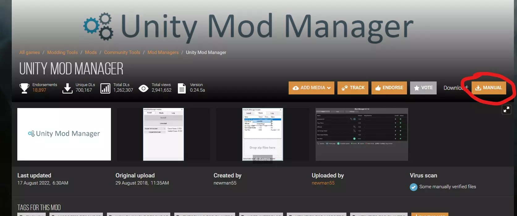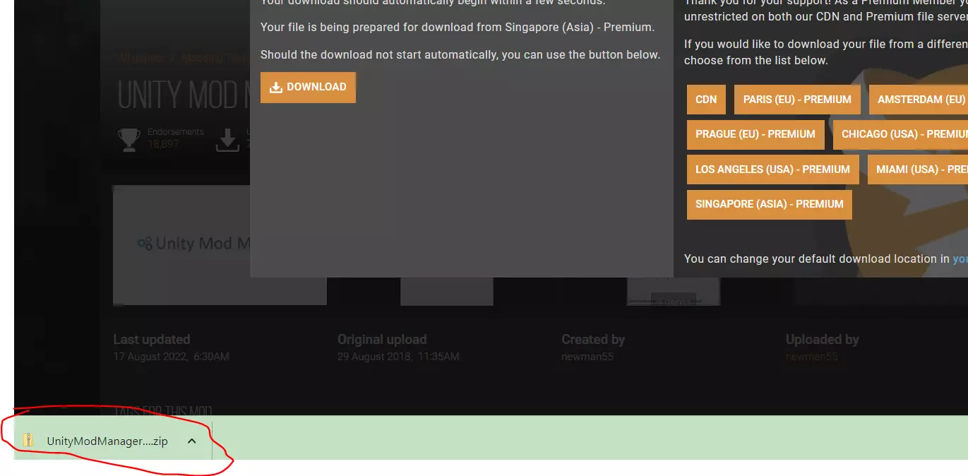为新手提供的分步下载指南:此链接会将你引导至UnityModManager的Nexus Mods页面。