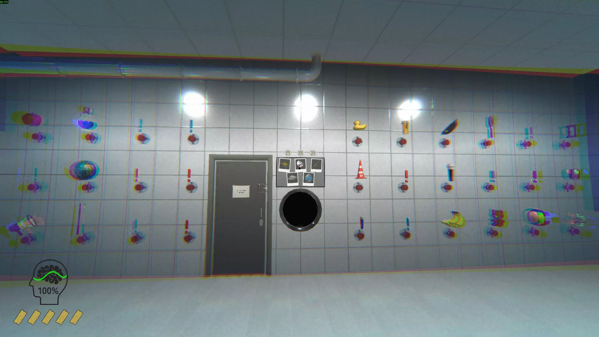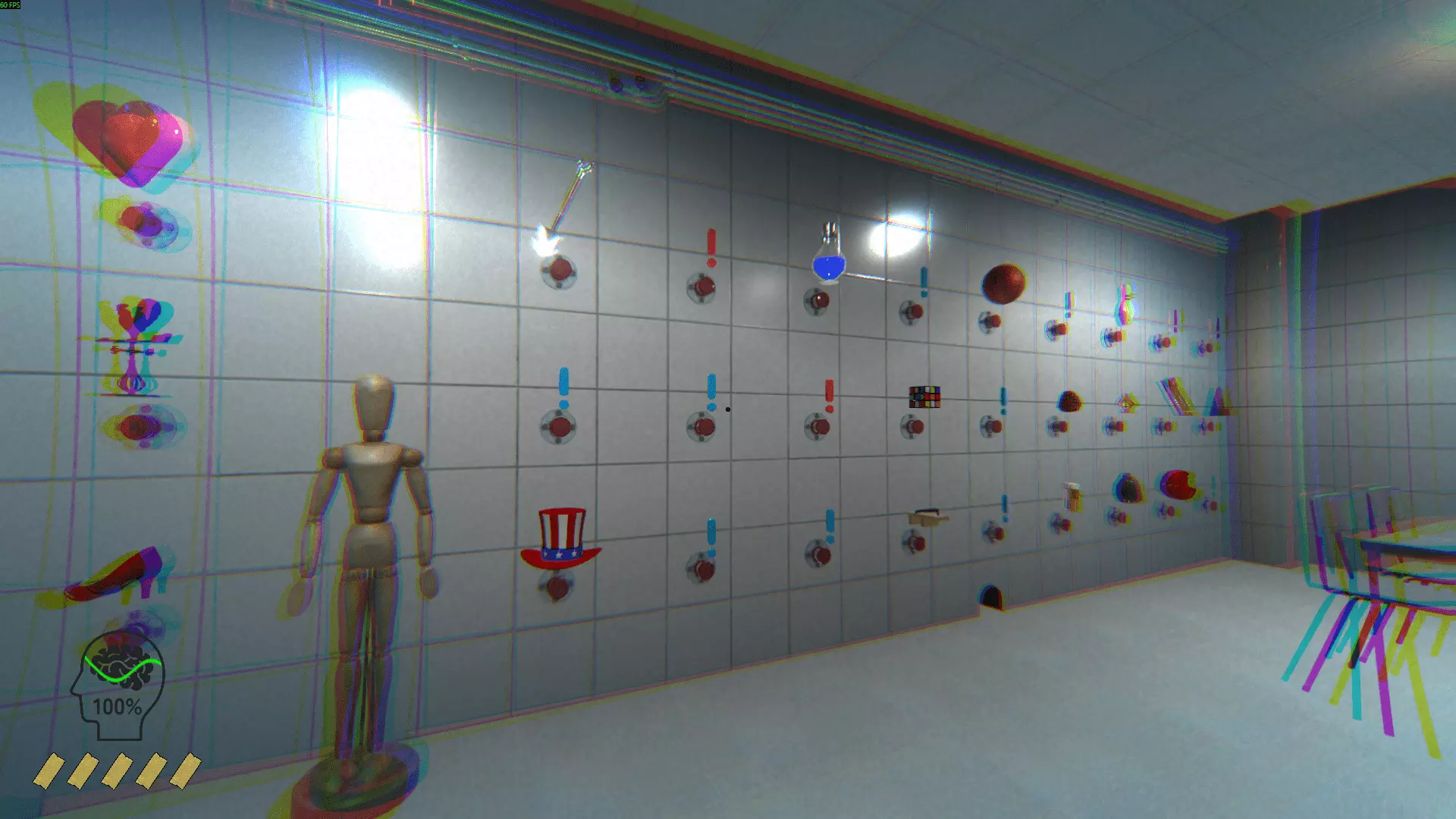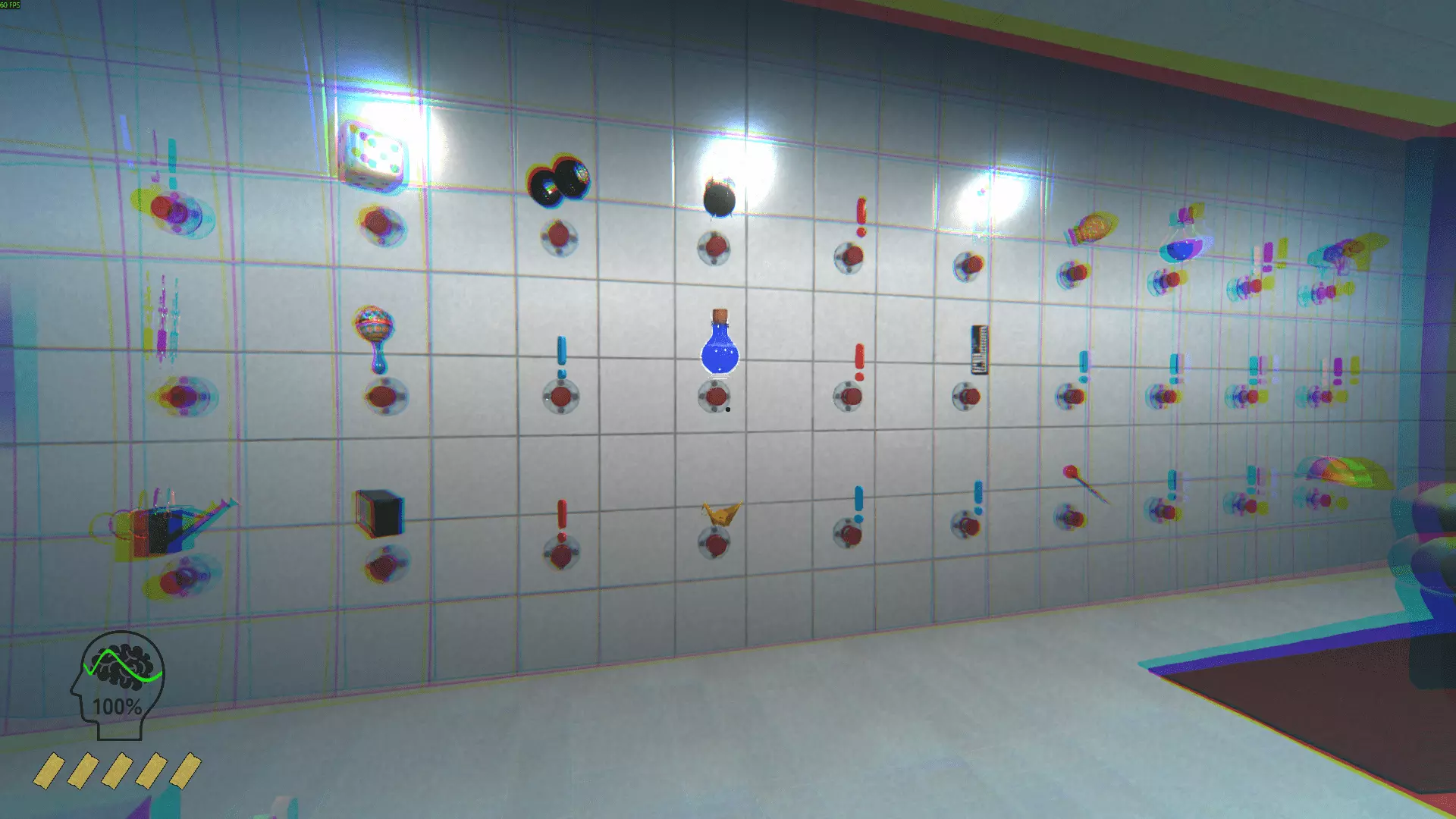心形球 带公鸡的翅膀 鞋子 铲子 管道里的男人 帽子 男孩 按钮(触发随机按钮的动作) 娃娃玻璃瓶(与幽灵平齐 影响理智) 汉堡 横幅 魔方 木拖鞋 篮球 管道梯子 恐龙 管弦乐队 松果 药片 保龄球瓶 神灯 垃圾袋 幽灵 捕鼠器 达摩(亚洲的红色头部造型护身符) 弓(射中柱子时降低)理智)节拍器女孩(与男孩互动时解锁成就)3号墙。 沙发后面是下一面墙。
