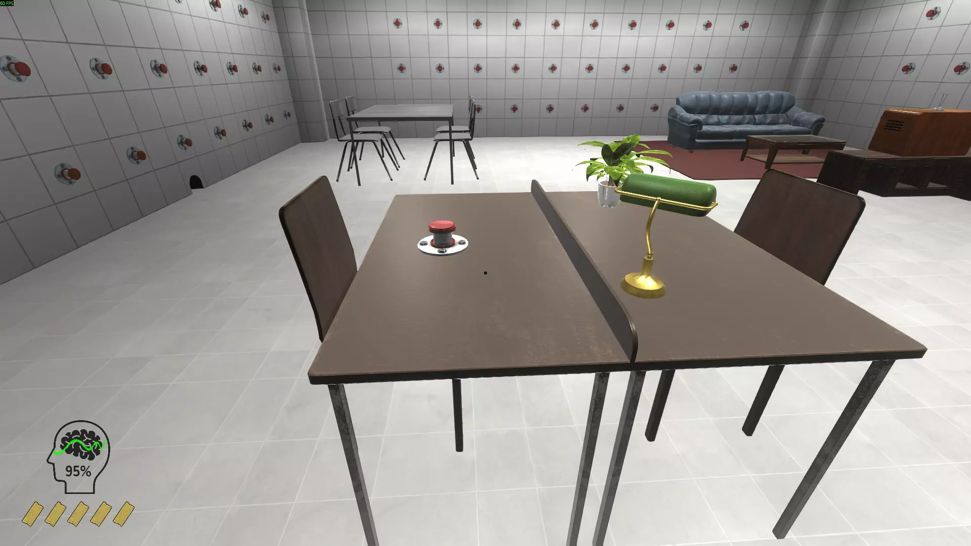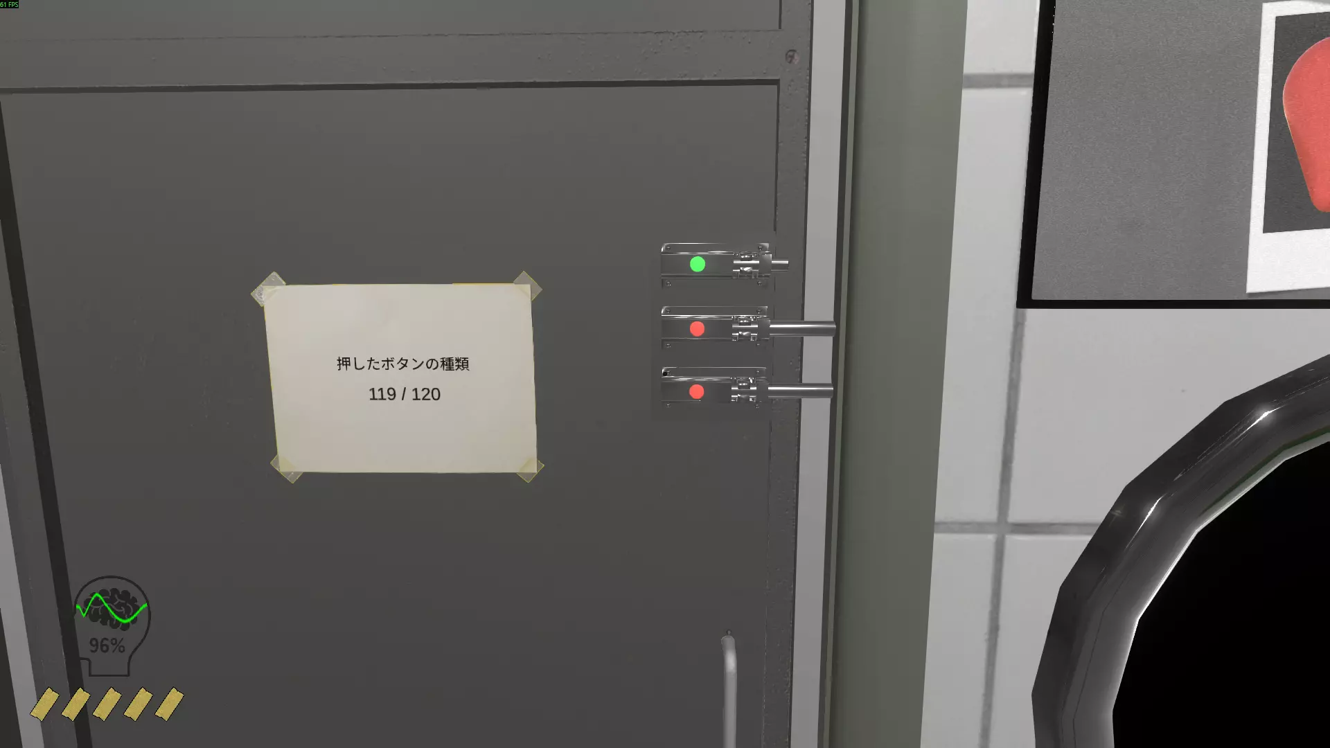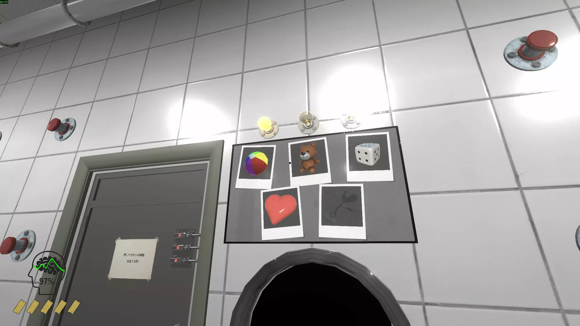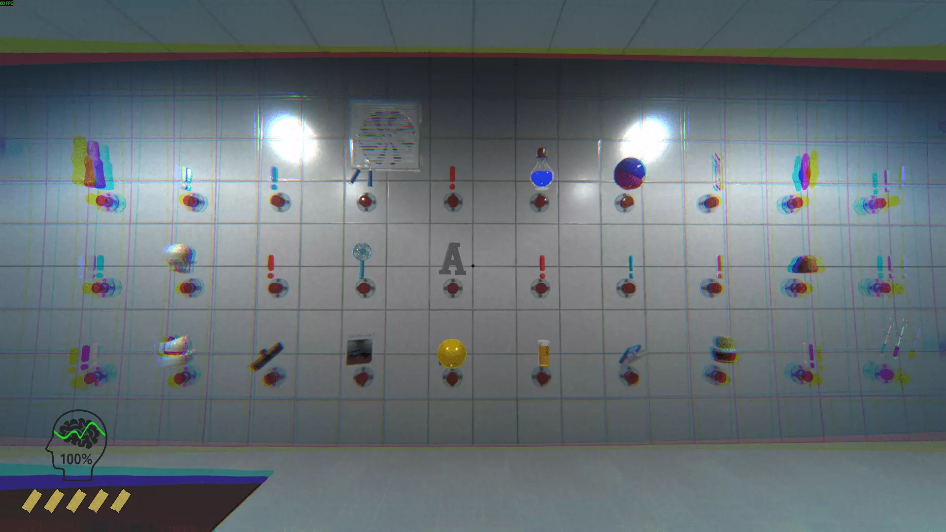 心形球 带公鸡的翅膀 鞋子 铲子 管道里的男人 帽子 男孩 按钮(触发随机按钮的动作) 娃娃玻璃瓶(与幽灵平齐 影响理智) 汉堡 横幅 魔方 木拖鞋 篮球 管道梯子 恐龙 管弦乐队 松果 药片 保龄球瓶 神灯 垃圾袋 幽灵 捕鼠器 达摩(亚洲的红色头部造型护身符) 弓(射中柱子时降低)理智)节拍器女孩(与男孩互动时解锁成就)3号墙。 沙发后面是下一面墙。