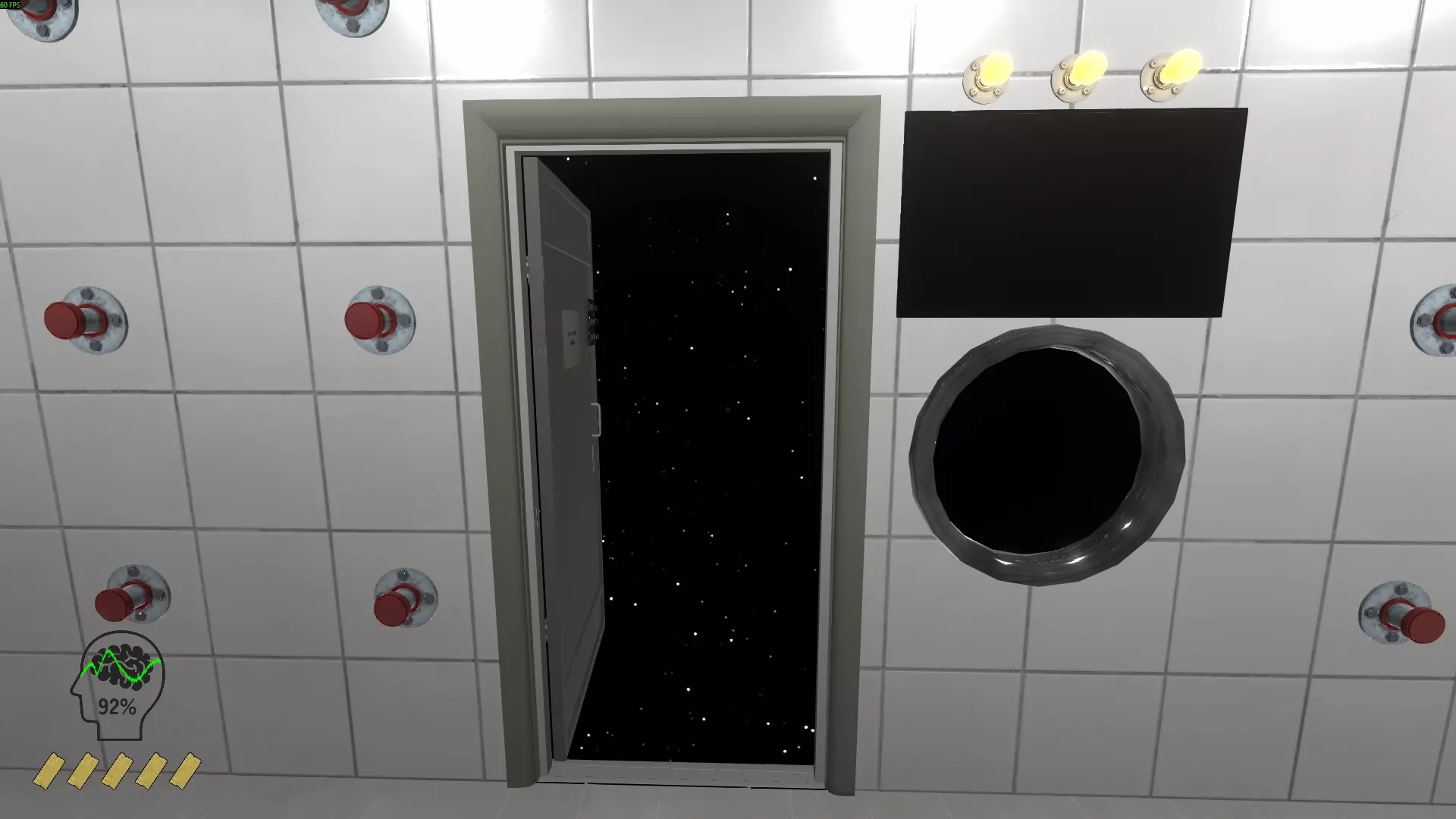 苹果 衣柜里的男人 扩音器 理智用玻璃瓶 星球 球拍 带玻璃门的柜子 幽灵 抽烟的人体模型 大手 横幅 幽灵 橡胶鸭子 圆锥体 磁铁 药片 幽灵 柜子里传来敲击声 平底锅 麦克风 香蕉 梳子 大按钮(与大手互动时激活成就) 老鼠 铃声和敲门声 幽灵 排球 沙漏 电脑鼠标 凹陷的罐子 第二面墙。接下来按顺时针方向走,前往有柜子和人体模型的墙边。