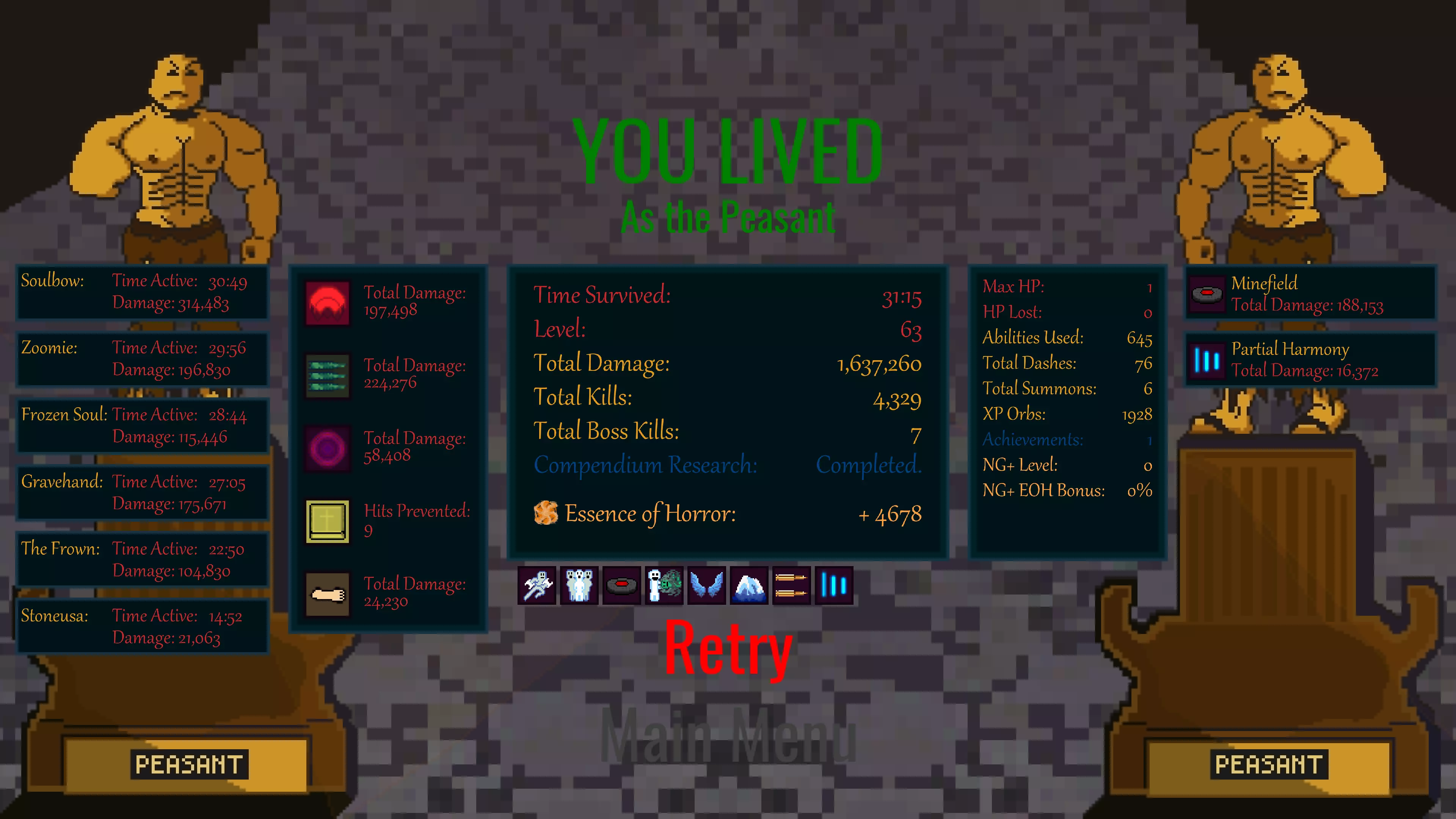 最终说明 我在游戏开始7分钟时获得了肾上腺素效果,因此关于可能被击中多少次仍能达成成就的大致计算如下: 前7分钟:使用复活技能可承受3次击中,使用反击技能可承受8次击中,总计11次 后23分钟:使用复活技能可承受11次击中,使用反击技能可承受约60次击中,总计71次 你大约可以被击中83次仍能获得成就!如果你选择了冥想天赋,还能额外承受14次击中,使总次数达到97次。