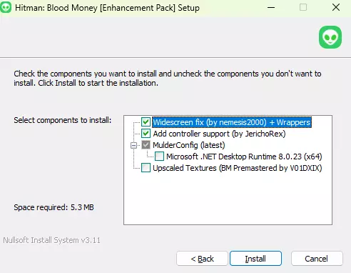 一种简单、自动化的方式来升级你的《杀手:血钱》安装,以添加宽屏和超宽屏支持、AI upscale 纹理、控制器支持、dgVoodoo、Vulkan(DXVK)等功能。包含你所需的一切。 此增强包说明 该增强包包含以简单且自动化的方式获得《杀手:血钱》最佳体验所需的一切。它是一个一键安装程序,将: 设置最高画质 INI 安装 elishacloud 的 dxWrapper(最新版本) 安装 nemesis2000 的宽屏修复补丁 安装 dgVoodoo2(最新版本,若检测到 Linux/Proton 则为 2.81.3 版本) 安装 DXVK(最新版本) 将所有这些进行配置,并将帧率锁定为 60 FPS 以防止错误 添加控制器支持(JerichoRex 的 v10 版本) 安装《杀手:血钱》Premastered v1 版本5:一个令人惊艳的高清纹理包(由V01DXIX制作) 添加MulderConfig配置界面,可用于设置宽屏及超宽屏分辨率、选择API(DX 11、Vulkan、DX9)等。 此增强包已在GOG和Steam版本上测试成功。 关于Mulderland和MulderLoad 如果你不了解我或我的项目,我制作开源安装程序来对视频游戏进行现代化处理,并在我的网站Mulderland上发布。这些安装程序使用NSIS编写,我称之为“MulderLoad”。 每个MulderLoad安装程序的源代码可在Github仓库中查看,安装程序本身也通过Github Actions自动构建(编译)。应用增强包 1) 获取最新版本的安装程序,点击“下载”以获取文件“hitman-blood-money-enhancement-pack.exe” 无需以管理员身份运行。如果安装程序无法运行,请阅读帮助页面中的“A MulderLoad installer refuses to run”部分 3) 按照指示操作,你应该会看到以下内容:屏幕1: