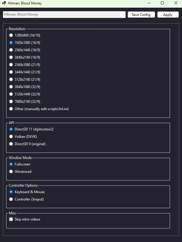 我推荐尝试DXVK。如果它对你有效,那它可能是最稳定且性能最佳的选项。最初,它曾是默认API,但有部分玩家反馈在全屏模式下会出现黑屏问题。因此,我决定将dgVoodoo2设为默认API。 当你做出选择后,务必点击以下两个按钮: 保存配置(此按钮会将你的偏好设置保存到MulderConfig中,这样下次启动时,你就能看到之前的选择) 应用(此按钮会将你的偏好设置真正应用到游戏中) 故障排除/常见问题 1) MulderConfig无法运行 这很可能是因为你没有安装“Microsoft .NET Desktop Runtime 8”(并且在安装过程中没有勾选它)。请安装该组件。2) 如何重新运行MulderConfig? MulderConfig位于游戏安装文件夹中。 在Steam中,右键点击【杀手:契约】>管理>浏览本地文件,即可找到它。 3) README在哪里? 它位于游戏安装文件夹的“@mulderload”子文件夹中。 在Steam中,右键点击【杀手:契约】>管理>浏览本地文件,然后打开“@mulderload”文件夹。 4) 我遇到了其他问题 请先阅读README :) 其中包含一些有用的信息。 如果仍未解决你的问题,请在此处发表评论——我会尽力帮助你,如果你发现了bug,我也会修复该模组包。 结语 感谢阅读本指南,希望它能对你有所帮助。