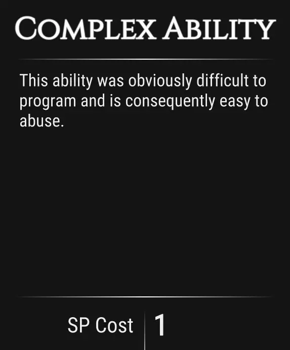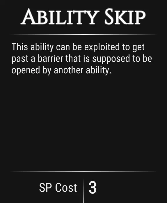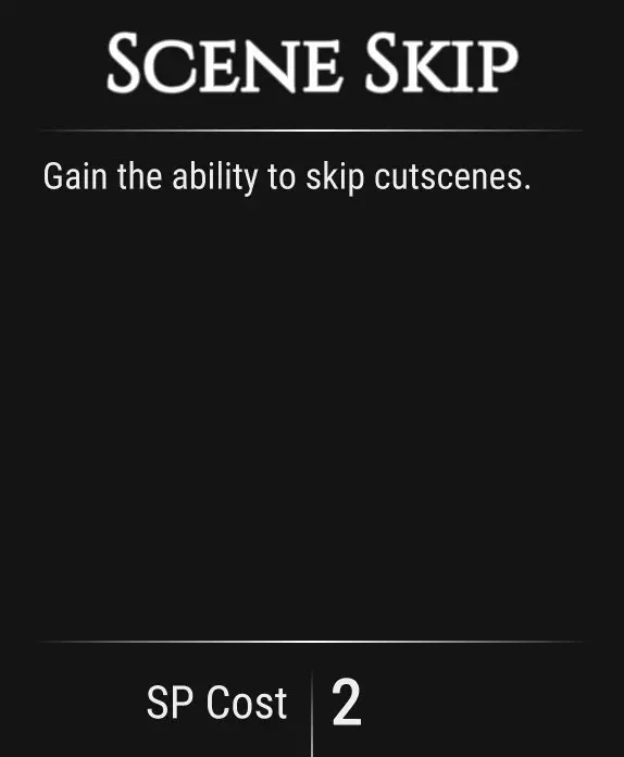获得跳过过场动画的功能。 技能消耗2点。 引用自【TOTONGA】:不要选这个!如果这么做,你会错过故事的重要部分,尤其是当你还不看日志的时候。 复杂技能
