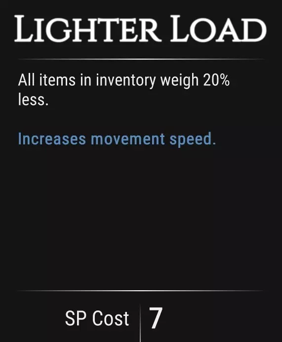 背包中所有物品重量减少20%。 提升移动速度。 技能消耗7点。 徒步旅行