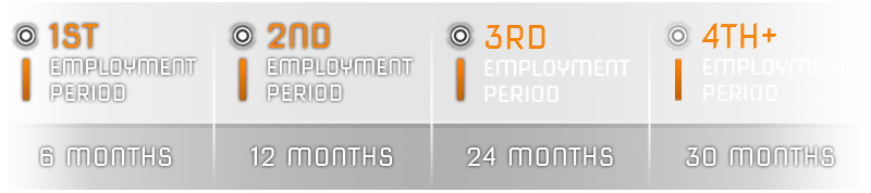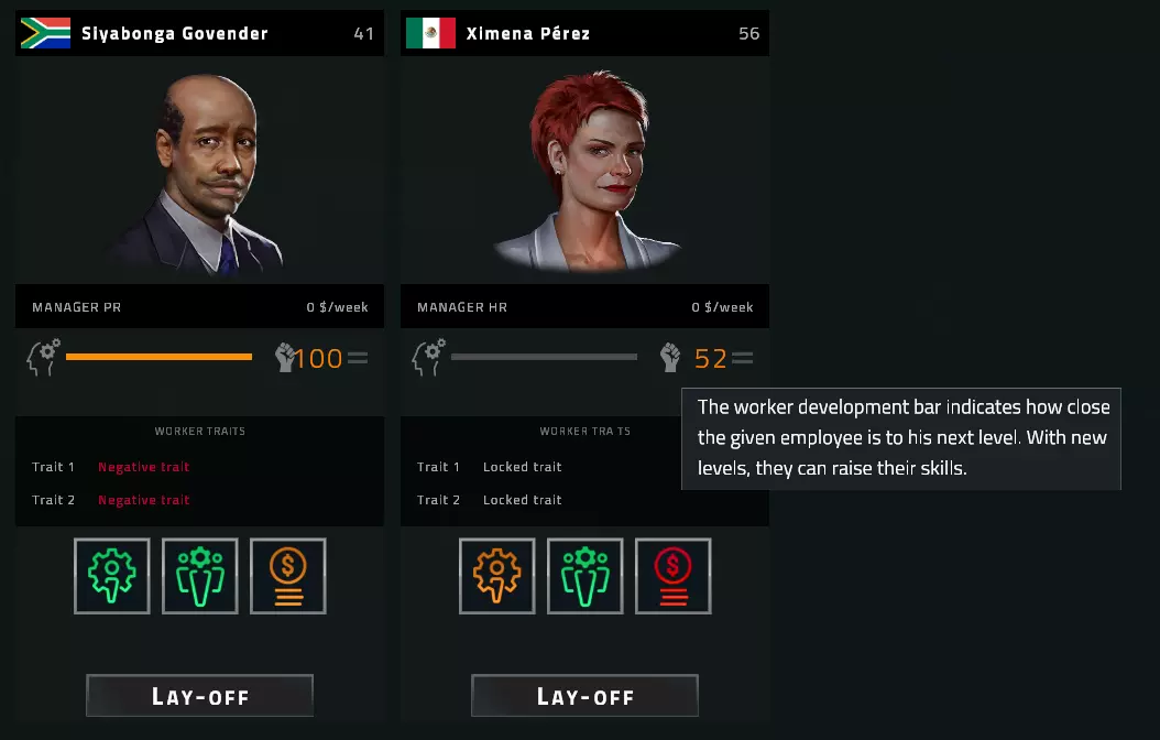 生产力 员工每完成四个工作周期后(详见表2),将获得奖励:提升一项技能(根据所选难度等级,最高可+2点)。 每位员工头像下方设有一个员工发展进度条,显示该员工距离升级还有多远。达到下一级别并提升员工技能后,进度条将重置。