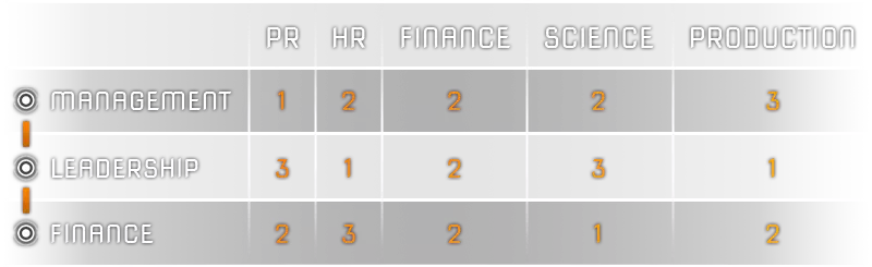 表1:技能与部门乘数表 示例: 管理技能高的员工在生产部门效率最高,而在公关部门效率最低。 将员工分配到特定部门会使该部门的生产力以百分比形式提升。因此,为该部门提供资金所带来的所有收益都会相应地按一定百分比增加。