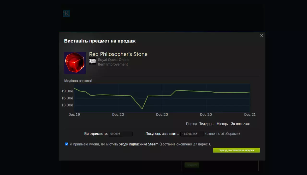 接下来只需设定你想要的价格,然后等待变得更富有(开玩笑……你可以在价格曲线上看到所选物品的销售动态,还会显示当前的实际价格……我建议就按这个实际价格来设定,不过原则上也不禁止你设定任何价格)