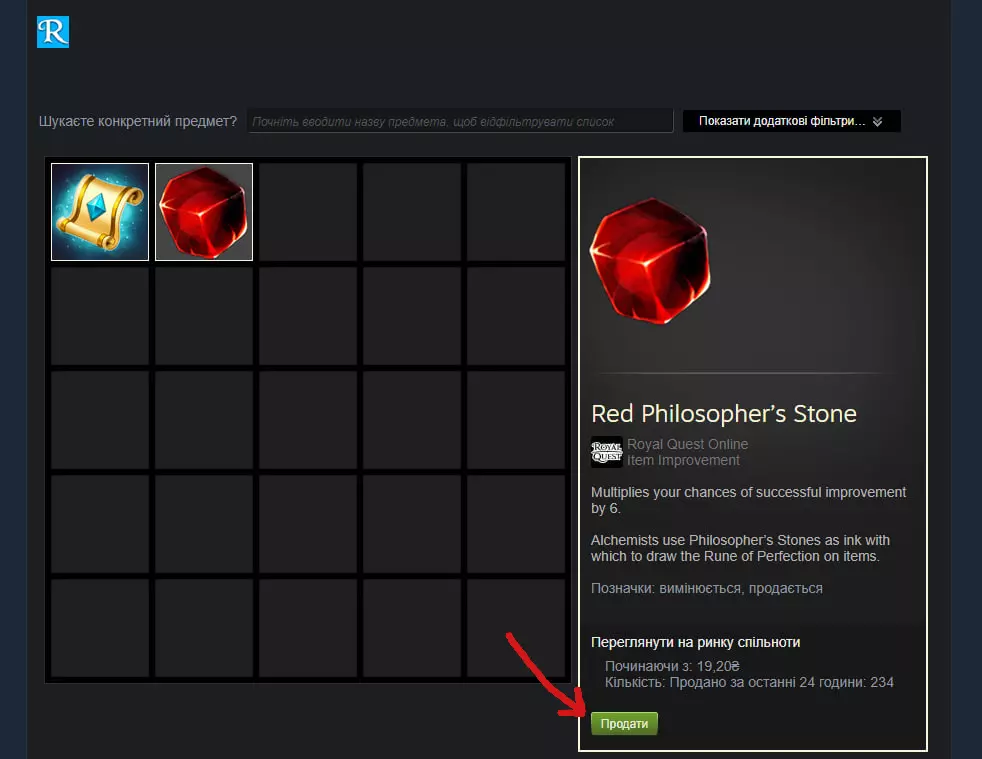 我看到过很多类似的问题,虽然对很多人来说这似乎是显而易见的,但我还是决定来探讨一下这个问题。 开始 首先,要在Steam交易市场上出售物品,你需要在库存中有这些“物品”(例如哲学之石、苏尔古奇、转化之卡等等)。你可能通过以下方式获得上述物品:从其他玩家处购买、开启付费宝箱,或从需要钥匙的宝箱中获取(钥匙有4种:铁钥匙、金钥匙、水晶钥匙和紫晶钥匙)。我将以【红色哲学石】为例进行说明,需要注意的是,你一次只能出售1个物品,例如你有5块石头,需要先将它们拆分。