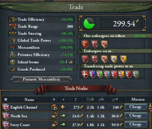 引导贸易的商人将提升贸易价值,这既得益于商人固有的引导加成(最多5名来自任意国家的商人),也受本国贸易引导修正值的影响。