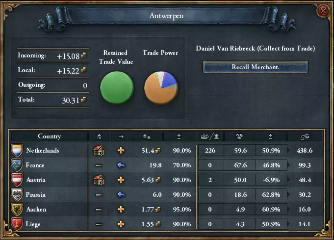 既然我们已经了解了贸易界面以及各项修正值的作用,接下来让我们深入了解第二个最重要的贸易界面:贸易节点! 贸易节点界面会显示全球各个节点的所有必要信息。它们代表着各个省份的市场控制权(你可以通过贸易地图模式查看哪些省份属于哪个贸易节点!)。 贸易节点的顶部会显示节点名称。虽然并非至关重要,但如果你还不熟悉所有贸易节点,它能帮助你更好地进行全局掌控! 界面中左部分显示的是黄金流量。这是决定一个贸易节点富裕程度的关键因素。流入是指由其他商人、轻型船只或省份重商主义引导的来自前贸易节点的贸易财富量。 本地是指贸易节点内产生的财富量——这是贸易节点内贸易价值的总和(稍后将更详细地讨论!);一个简单的经验法则是:省份产生的生产收入越多,其贸易价值就越高,贸易节点内的财富也就越多。 流出是指从该贸易节点流出的财富量。除热那亚、英吉利海峡和威尼斯贸易节点外,其他任何贸易节点都可能发生这种情况。 总计是指贸易节点内剩余可供争夺的财富量。中间位置是上述黄金流动的图形化展示。它能直观显示有多少黄金被转移以及贸易节点中剩余多少。同时,它还通过便捷的饼图展示了某个国家控制该贸易节点财富的比例。 中间偏右位置有两个可选操作(除非是终点贸易节点,此时“转移贸易”不可用):“收集贸易”和“转移贸易”。这两个操作的作用正如其名。 “收集贸易”会消耗一名商人,利用你的贸易力量获取财富。其数额大致为你的贸易力量百分比乘以总财富,当然,这一数额还会受到贸易收入修正的加成!如果你在非贸易港口(可以说是贸易“首都”)的贸易节点进行贸易收集,你的贸易力量百分比会受到非常严重的惩罚——因此只有当你经验足够丰富,能够判断这样做值得付出代价时,才应该这样做! 贸易引导需要派遣一名商人,利用你的贸易力量来引导贸易。你现在是将你的贸易力量所产生的财富导向你选择的下游贸易节点。贸易引导属性会增加这部分贸易力量——因此高贸易引导值确实能显著提升贸易力量!贸易引导不会对贸易力量造成惩罚。下方是在贸易节点拥有贸易力量的所有国家的详细列表,包括其商人正在执行的任务、他们的贸易额以及拥有的贸易力量。 商人的任务可以是【收集】、【引导】,在极少数贸易节点没有商人的情况下,还会出现【上游引导】。上游引导发生在该贸易节点位于你的贸易港口之后的情况。收集用黄色+号表示,下游引导用向右的绿色箭头表示,上游引导用向左的蓝色箭头表示。 表格中间显示了收集或引导的财富数量。该数字显示的是应用所有修正后你引导或获得的贸易额——因此贸易引导修正和收入修正已包含在这个数字中!贸易力量有多种获取途径。一名商人本身可提供2贸易力量,这并不算多。但如果是内陆贸易节点,商人可通过商队加成额外获得最多50贸易力量。轻型船只造价适中,能够“巡逻”贸易节点以增加贸易力量,是海军贸易节点中获取贸易力量的主要方式之一。最后,省份也会提供贸易力量,具体数值取决于其位置和建筑。 商人与贸易