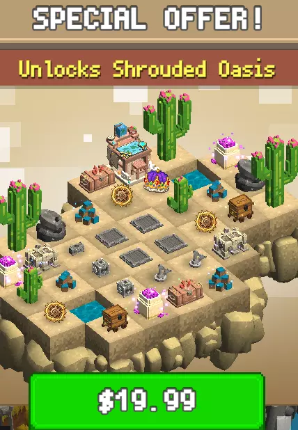 游戏内设有内容十分丰富的现实货币道具商店,你几乎可以购买所有物品,甚至能跳过游戏的大部分内容,但何必呢?在这里你可以用游戏内金币购买物品,有时甚至会出售符文。所以每次游玩时一定要查看一下,商店的商品每六小时刷新一次。 时不时会弹出优惠窗口,向你推销工具或第二个制作台。 每次通关地下城后,游戏会提供花费5个符文购买第二个宝箱的选项。如果频繁使用此功能,可以减少刷取时间,但游戏中符文的获取量很少,且通过其他方式购买价格昂贵(需花费现实货币)。 可购买区域