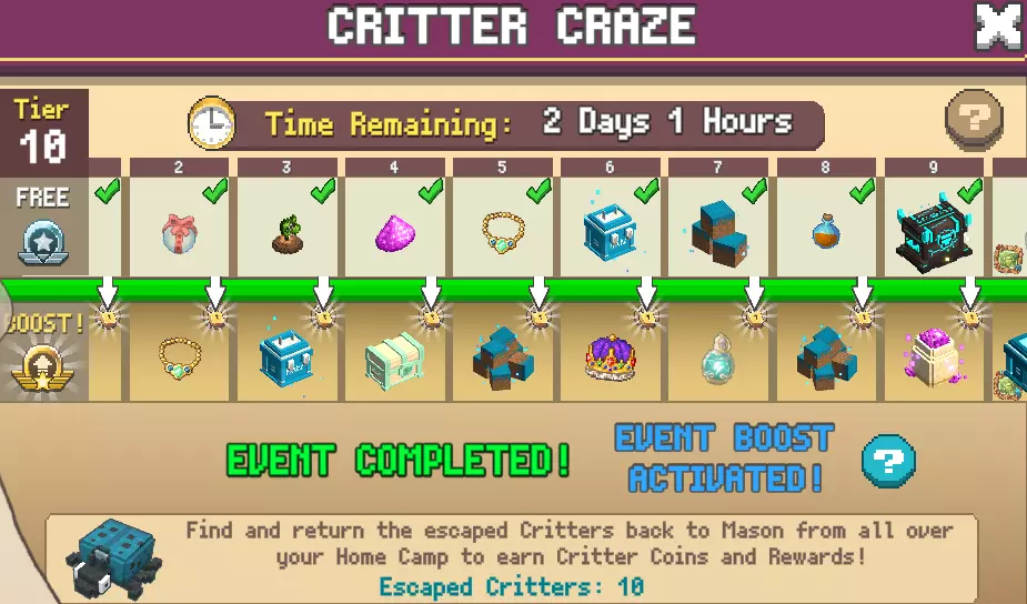 你还可以收集最多三个同等级的箱子,这些箱子会提供该等级和/或更低等级的一些资源。 箱子的获取存在循环机制:首次运行时你会获得1个箱子,第二次运行获得2个,第三次运行获得3个,之后会重置为下一次运行获得1个箱子。但你需要手动拾取这些箱子,它们不会自动获取! 当达到特定积分里程碑时,地下城会给予额外奖励。这些里程碑可在地下城菜单中查看。 如果你尚未装备所需工具,或者工具正在铁砧上修理,则无法进入地下城。 有时游戏会自动卸下你的工具,你需要手动重新装备。当你同时使用多个相同资源等级的工具(例如两把镐子)时,就会出现这种情况。 小提示:主地图上的气球