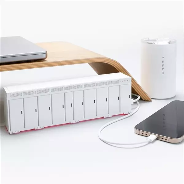不仅复刻了棱角分明的矩形轮廓与哑光金属质感涂层,还设计了可开启的操作间门,内部复刻电池组与线缆结构,顶部还还原了散热风扇造型。 右上角嵌入特斯拉LOGO,底部配有一圈灯带,激活充电时LOGO与灯带将亮起红色环境光,兼具收藏性与科技感。