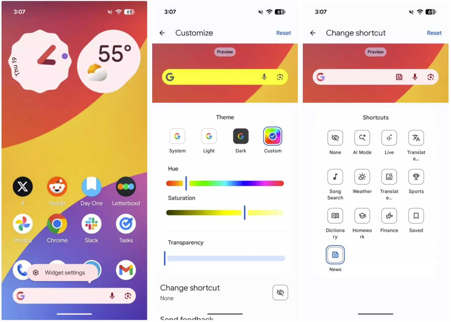 根据Android Authority的上手报告,在Android 17 Beta 1中,用户已能够完全移除主屏幕顶部的“At a Glance”小部件,从而释放出一整行屏幕空间。同时,长按底部的谷歌搜索栏会弹出“Widget settings”选项,允许用户对其外观进行调整。这两项自定义能力此前仅限于标准小部件,而Pixel的固定组件则不支持。