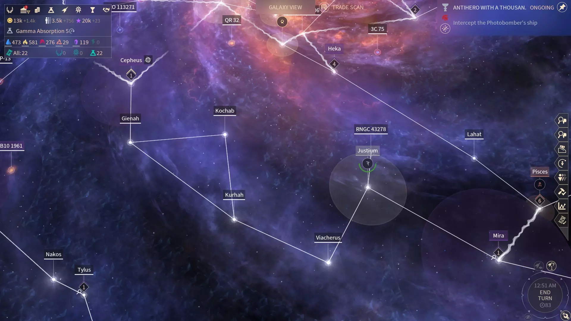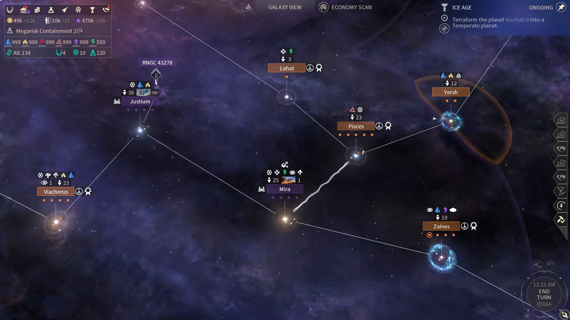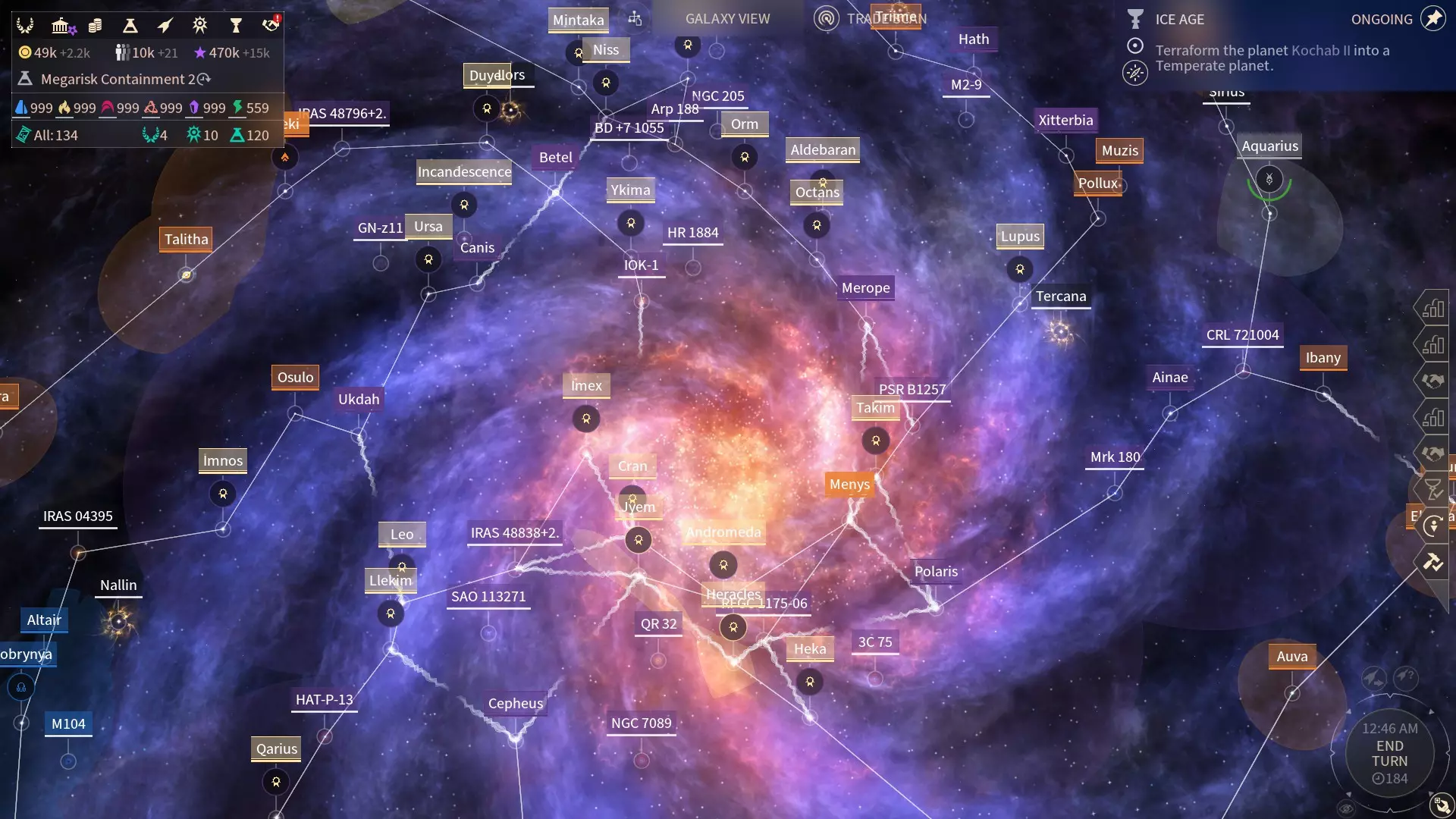 如你所见,这里同时有和平标志和学院标志。在这种情况下,我们只使用学院按钮,不要为了自己获取一个星系而浪费机会。如果你需要新殖民地,直接用武力夺取即可,和平转化应专门用于将星系交给学院。 在这个例子中,这个星系需要花费几千影响力来买断,但由于我有将近五十万影响力,所以并不在意这点花费,因此不要浪费时间等待进度条填满。记住,他们随时可能宣战,到时候整个进度条都会重置为零。你在游戏中期可能没有这么多影响力,但这个理念仍然适用,拖延自己没有任何意义。 如果学院标志没有显示怎么办?以下情况可能会令人十分沮丧: - 一个星系至少需要有一座失落神庙,才能将该星系交给学院!如果神庙位于星系的另一端是不行的,升级必须存在于你要进行转化的星系上。 - 如果你与对手处于结盟、休战或战争状态,则无法转化星系,只有冷战和和平状态下才行。 - 如果星系处于封锁状态,也无法进行转化。 可能还有其他我记不起来的原因。如果有的话,请在评论中告诉我。 终局阶段 当你扩张到几乎覆盖整个星系后,你应该已经掌控了一切。 但如果AI没有殖民星系的其他区域该怎么办?以下是一个例子: