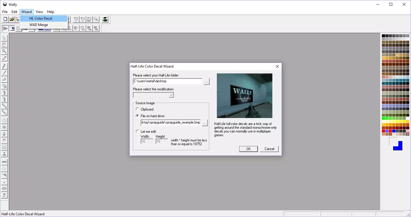 由于我熟悉相关程序,所以选择使用Wally进行工作,但任何其他能够编辑.wad文件的程序也可以使用,不过导入过程可能会更麻烦。虽然telefragged不再托管Wally,但你仍然可以在ModDB和其他一些网站上获取它,下载文件时务必扫描恶意软件,并从信誉良好的网站下载。Wally和许多其他.wad编辑程序可以导入图像,有时甚至专门用于半条命的贴花。