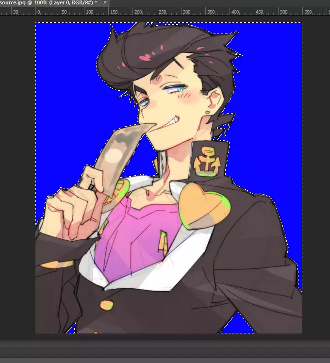 步骤1b. 创建透明蒙版(可选) 我还打算将背景设为透明,这意味着需要进行一些编辑。 使用Photoshop或类似软件,在背景图层下方创建一个蓝色图层(或其他与你想要保留的图像本身形成强烈对比的颜色),然后删除图像的部分区域,直到透明度达到你满意的效果。