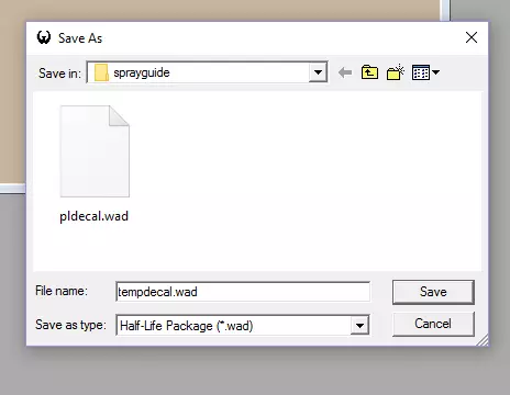 步骤5. 保存.wad文件。 Goldsource要求将自定义贴花保存为两个单独的文件,即pldecal.wad和tempdecal.wad。虽然我个人不清楚tempdecal的具体用途,但我知道pldecal是必需的,而tempdecal即使不是强制要求,也强烈建议保存。
