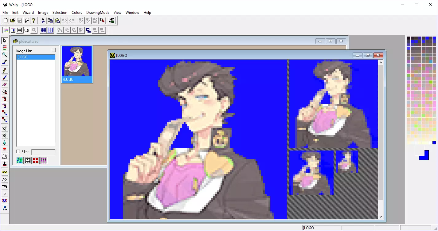 如果你的WAD编辑程序没有此类导入功能,不必担心;你只需手动创建一个新的WAD文件,将图像放入其中,并将其命名为“{LOGO”。 步骤4b. 再次修复Alpha蒙版(可选)。 你可能会困惑为什么我们还要讨论Alpha蒙版,因为即使在我的截图中,蒙版也清晰可见。