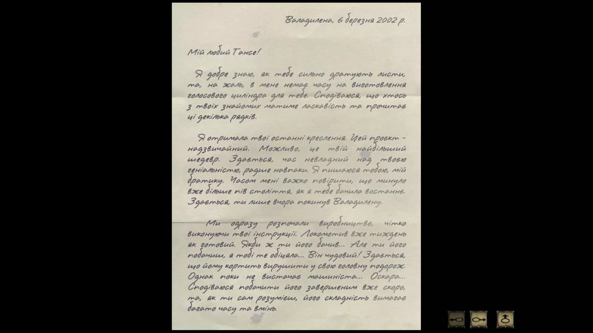 翻译作者:Art-Kandy。 翻译自法语,该语言为该游戏的原始语言。顺便说一下,游戏的大部分官方翻译都是基于英文版完成的,而英文版本身则是由法语版翻译而来。 该项目的目标是:制作乌克兰语文本翻译,以便能搭配法语配音进行游戏;向我心爱的游戏表达敬意(自2005年起,我就是它的忠实粉丝);巩固我的法语知识(我学习法语已有相当长的时间)。一些事实:完整的翻译(经典对话)耗时15个月。工作仅在业余时间进行。 原文体量:约80,000字(其中第一部分约51,000字)。 为89份文档的排版进行了必要的字体本土化处理(其中第一部分包含64份)。安装乌克兰语补丁的步骤如下: 1. 安装游戏本体(强烈建议安装法语版本,我会通过对比来说服你这样做); 2. 将Syberia_UkrainianVersion.zip压缩包的内容解压到游戏目录中。