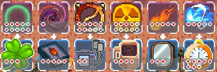 武器升级 有时升级提示中会出现你已选择的技能,若再次选择该技能,其等级将会提升。 你可以通过红色点数查看技能等级,如下所示: