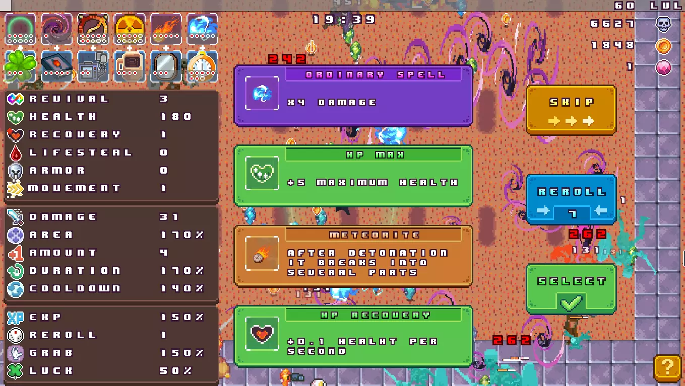 组合搭配 在游戏过程中击杀敌人时,你将通过收集水晶来提升角色等级,每次升级后,系统会提示你选择武器和技能。