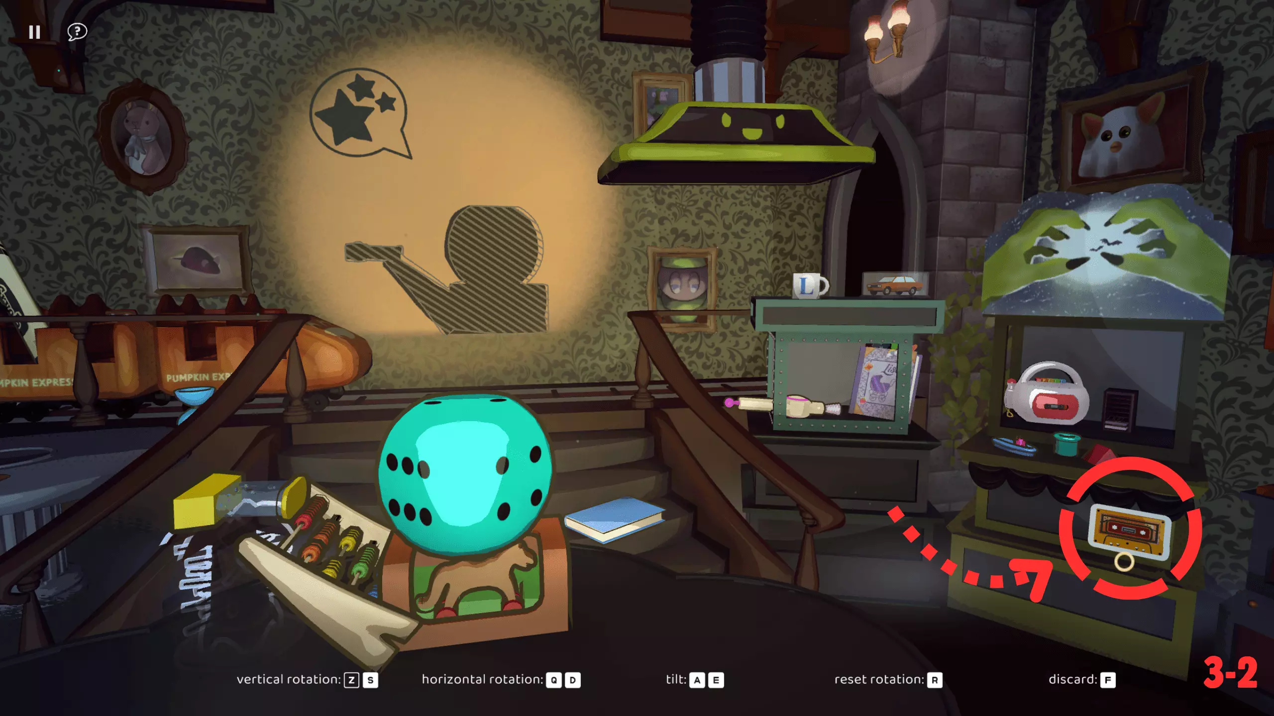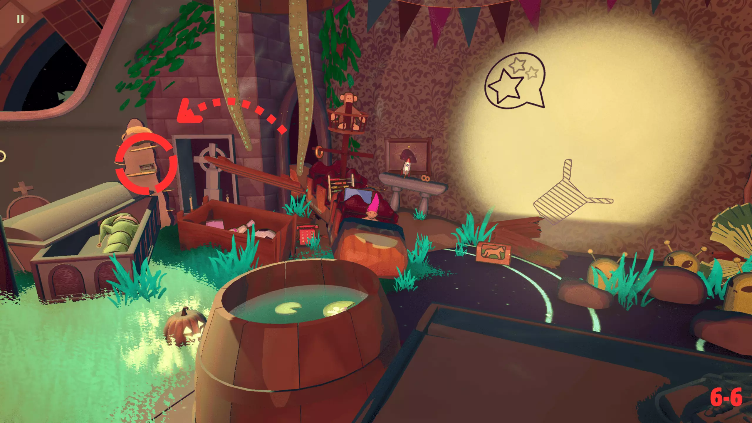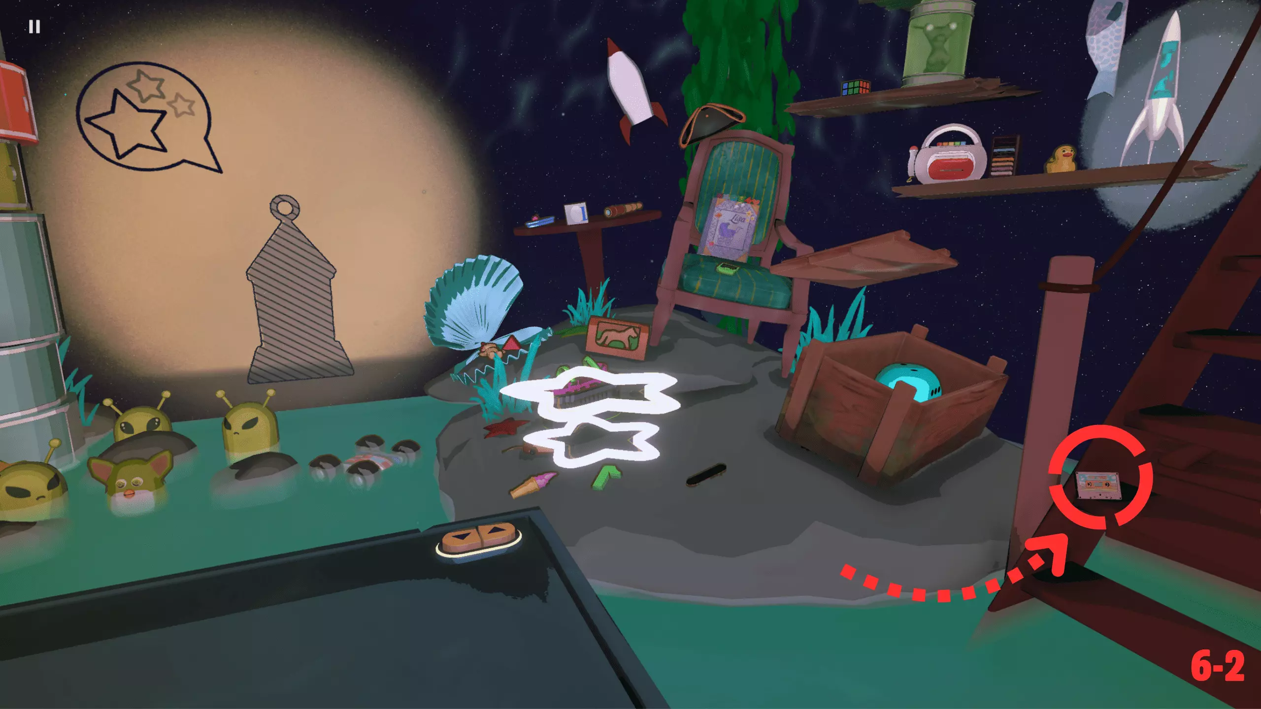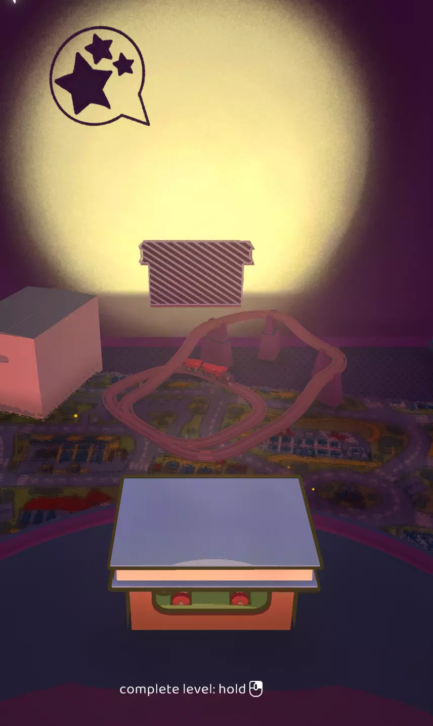 此关卡是唯一可获取Efficient成就的关卡。你需要仅使用一个玩具以三星评价完成关卡。 这也是轻松获取Messy成就的关卡。我的建议:等通关游戏后集齐所有磁带并将它们堆叠起来。这样,你就已经有8个物品用于解锁该成就了。不要忘记确认影子。