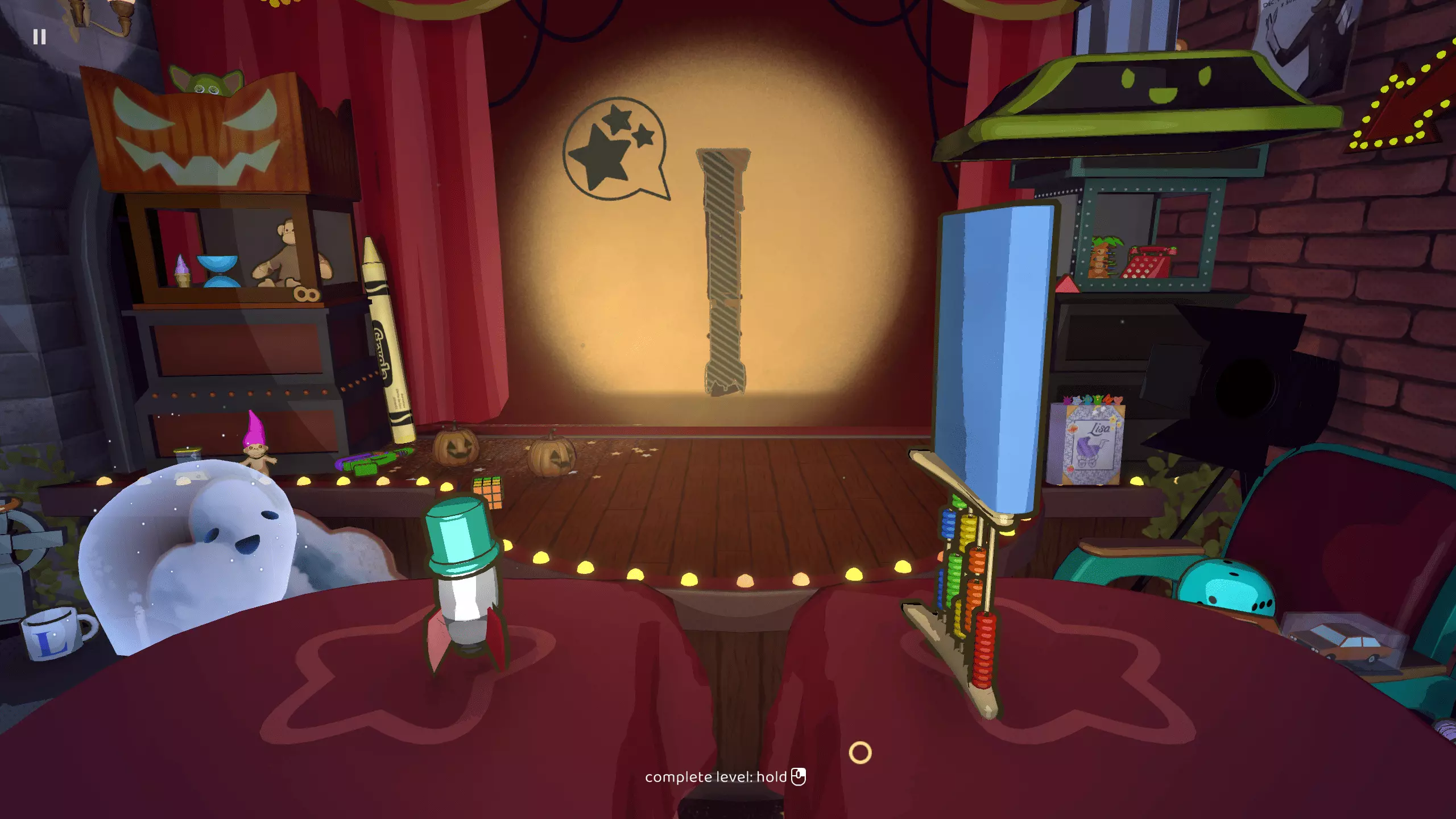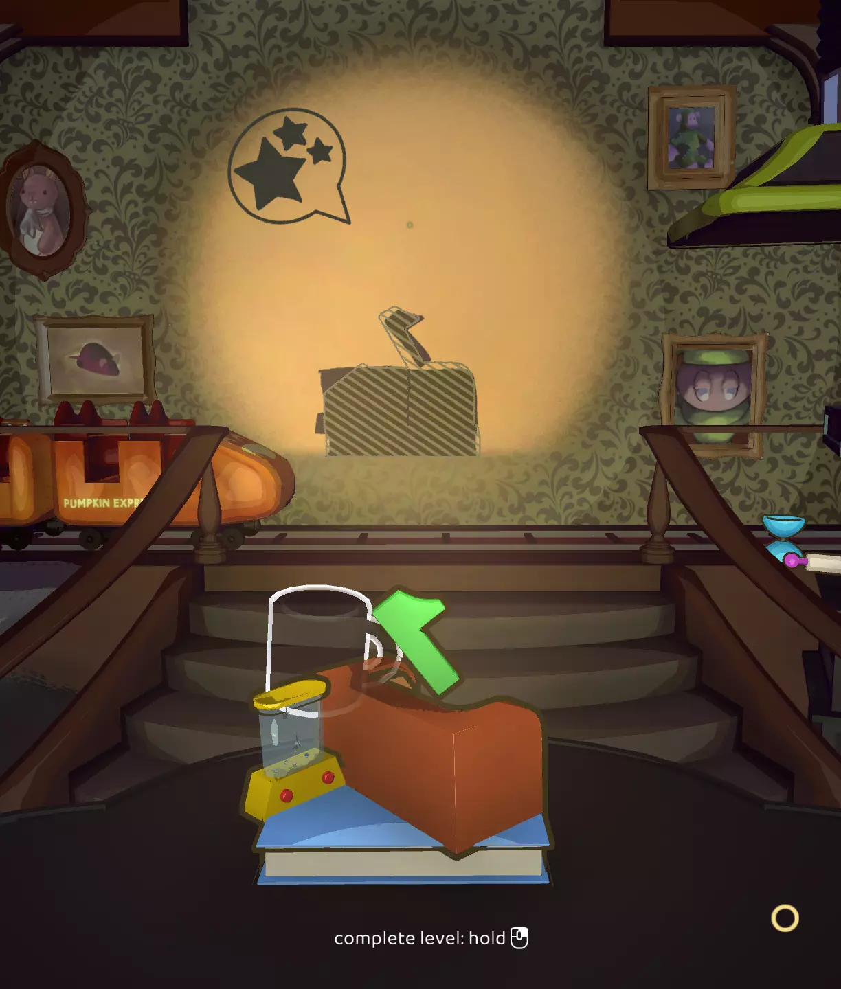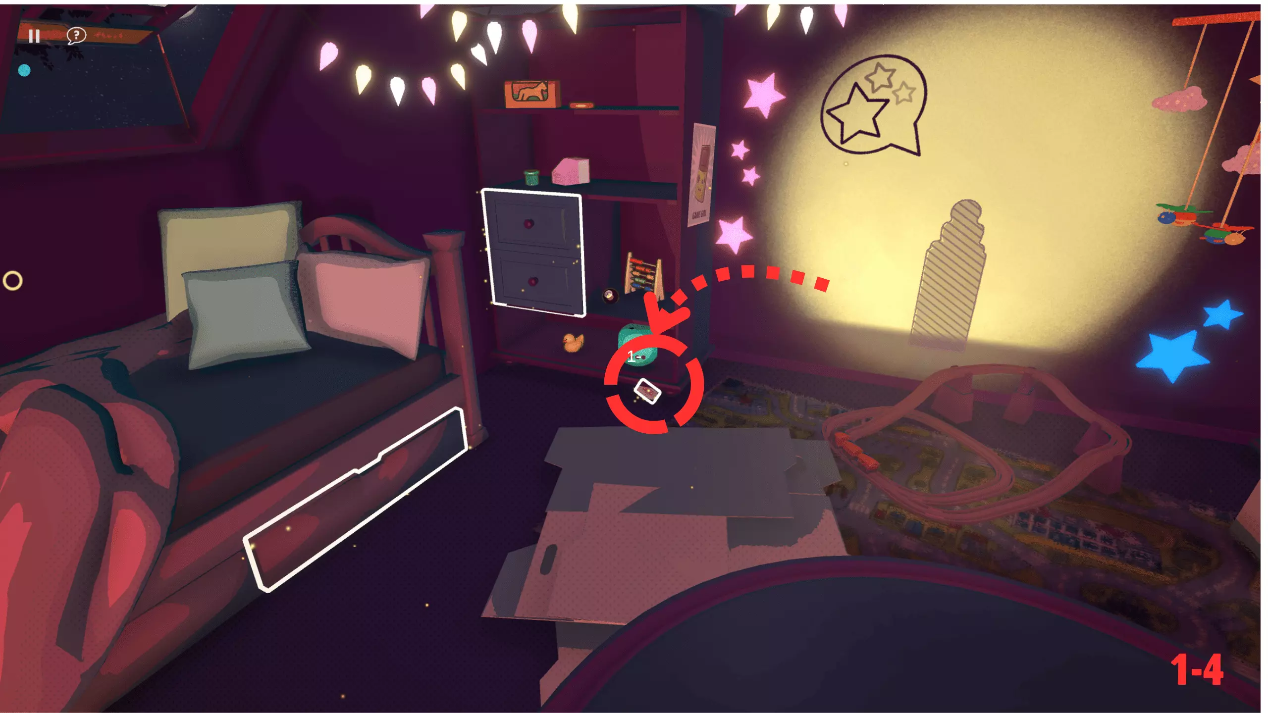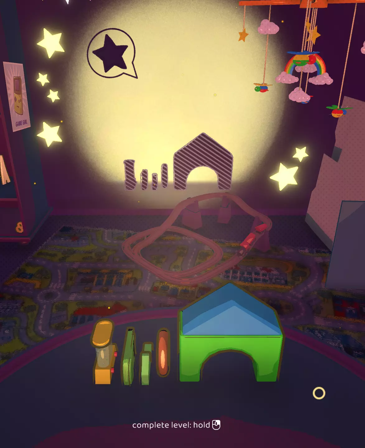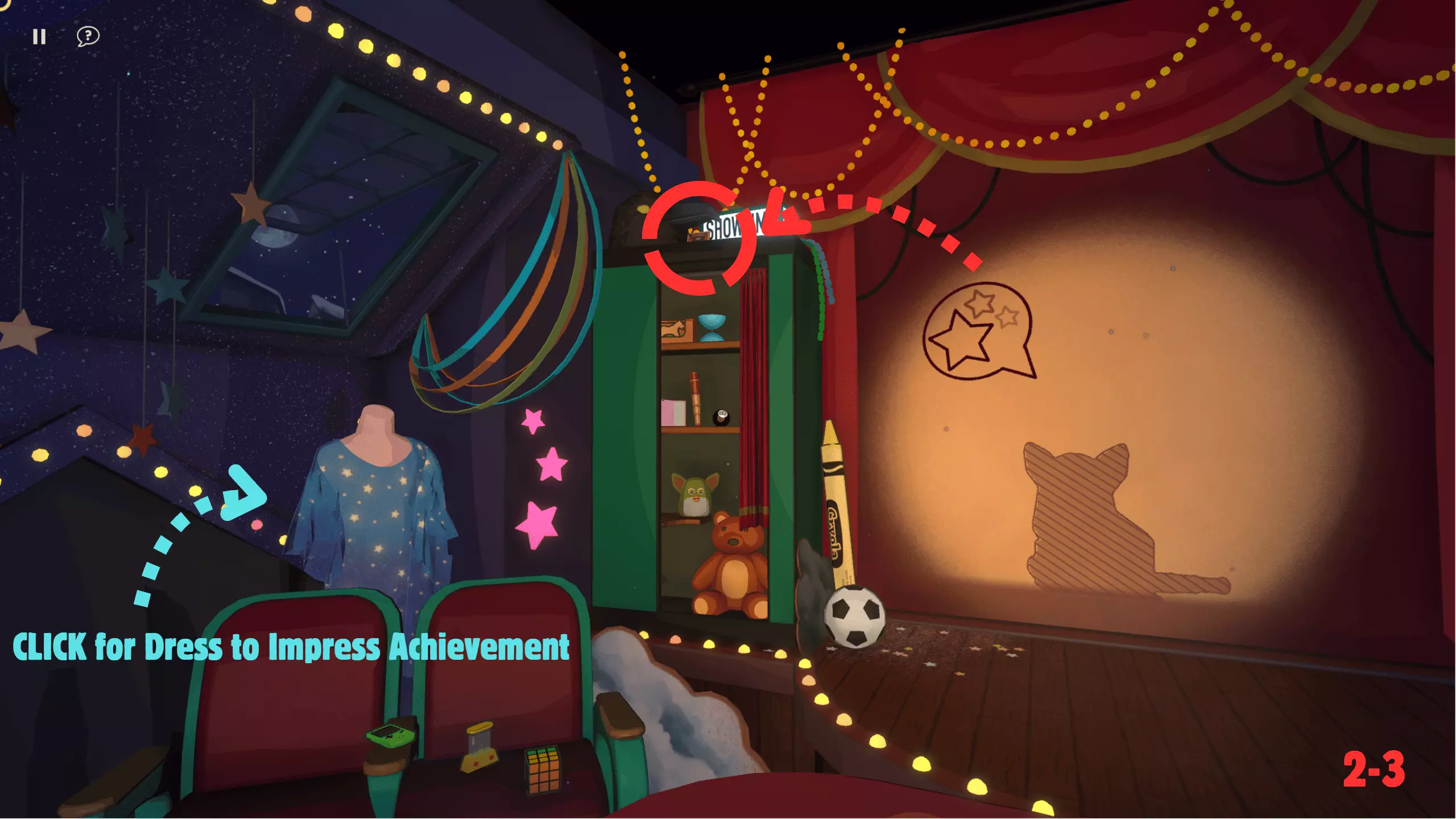 此关卡是唯一可获取Efficient成就的关卡。你需要仅使用一个玩具以三星评价完成关卡。 这也是轻松获取Messy成就的关卡。我的建议:等通关游戏后集齐所有磁带并将它们堆叠起来。这样,你就已经有8个物品用于解锁该成就了。不要忘记确认影子。