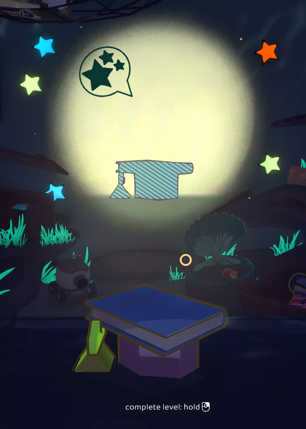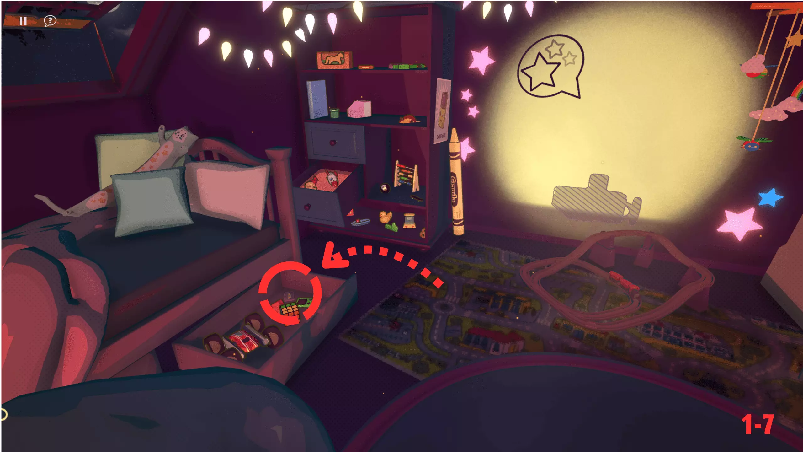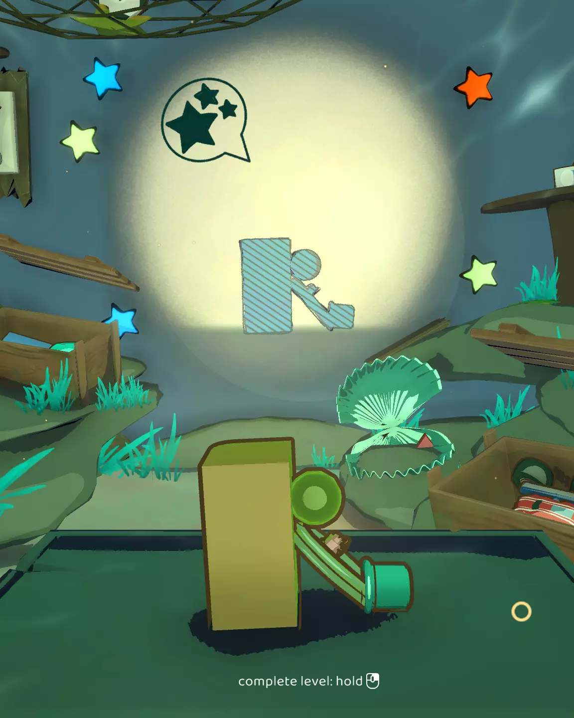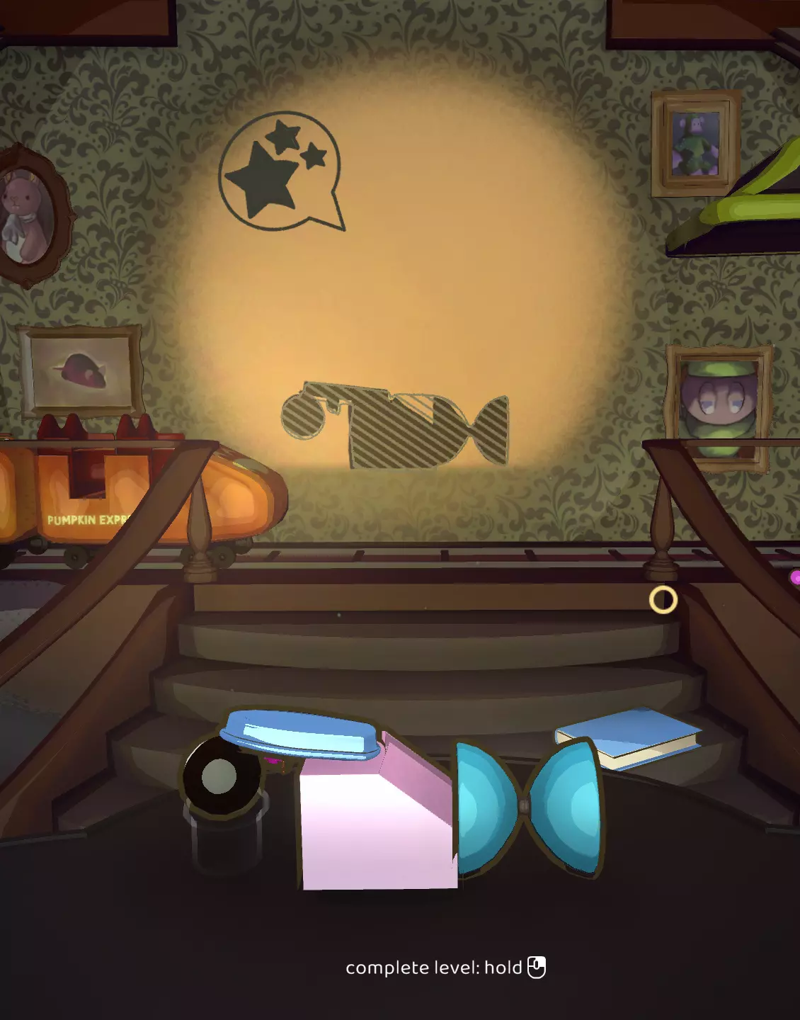 此关卡是唯一可获取Efficient成就的关卡。你需要仅使用一个玩具以三星评价完成关卡。 这也是轻松获取Messy成就的关卡。我的建议:等通关游戏后集齐所有磁带并将它们堆叠起来。这样,你就已经有8个物品用于解锁该成就了。不要忘记确认影子。