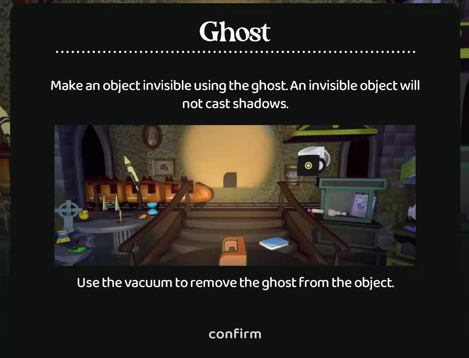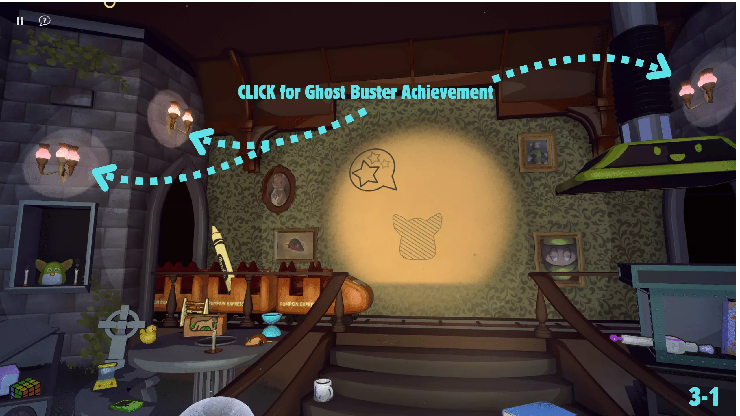 《Ghoul's Greetings !》中无关紧要的互动:与墙上的画作互动时会发出诡异的声音。玩具车有一个小动画,但不能用于影子游戏。 总结《Ghoul's Greetings !》:不可错过的成就