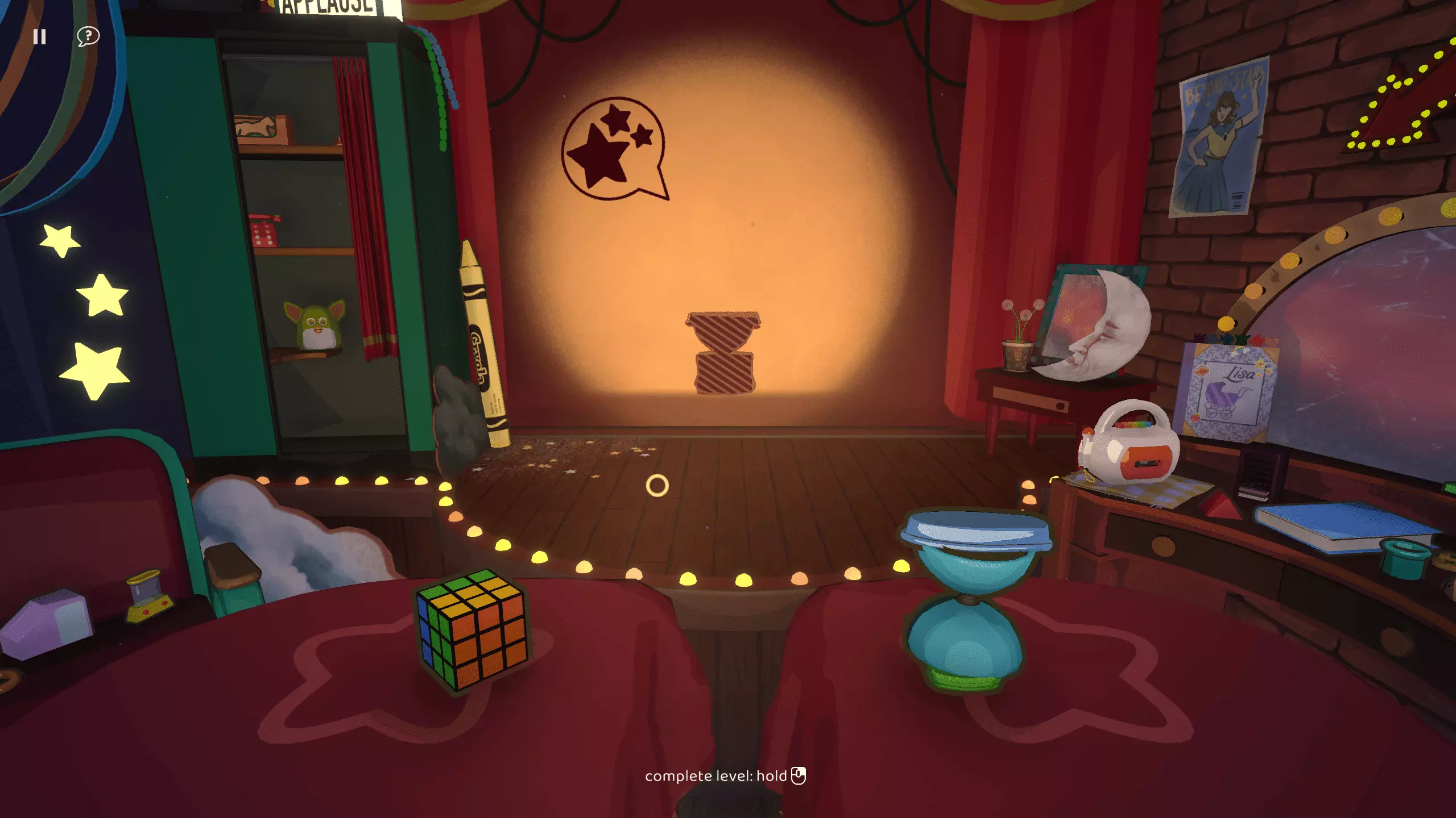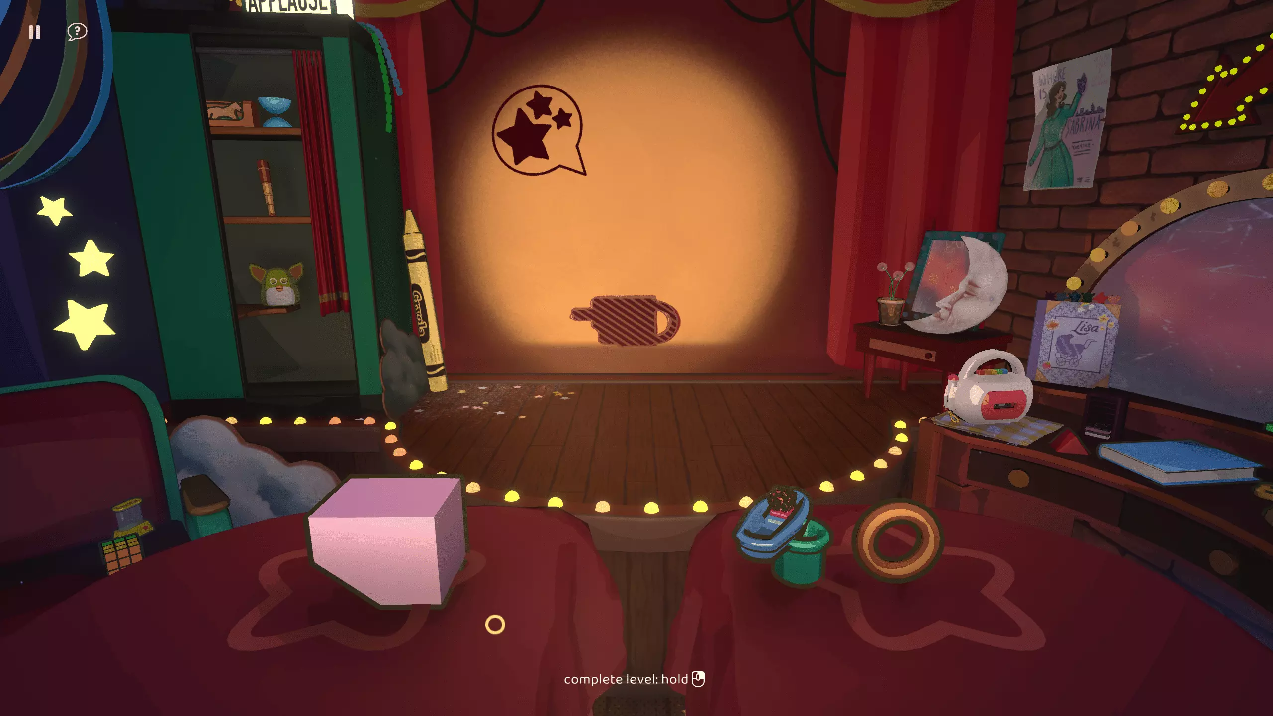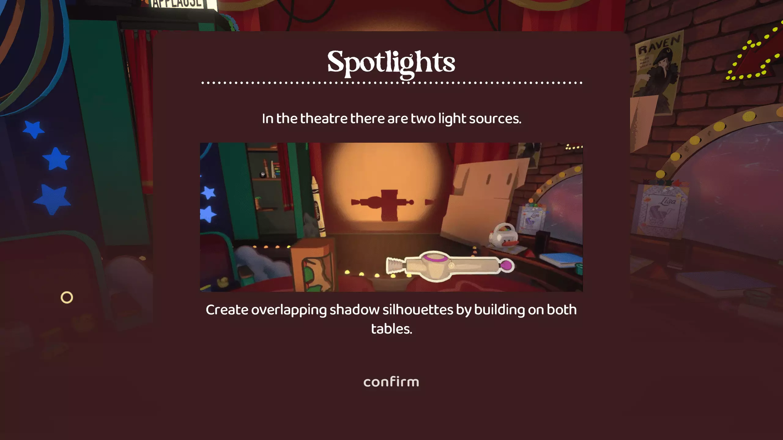 尘埃落定 在【欢迎丽莎】章节中以三星评价完成所有关卡 第二章:我的闪耀之星 第二章引入了聚光灯机制。通过使用两个光源,你可以使物体重叠。