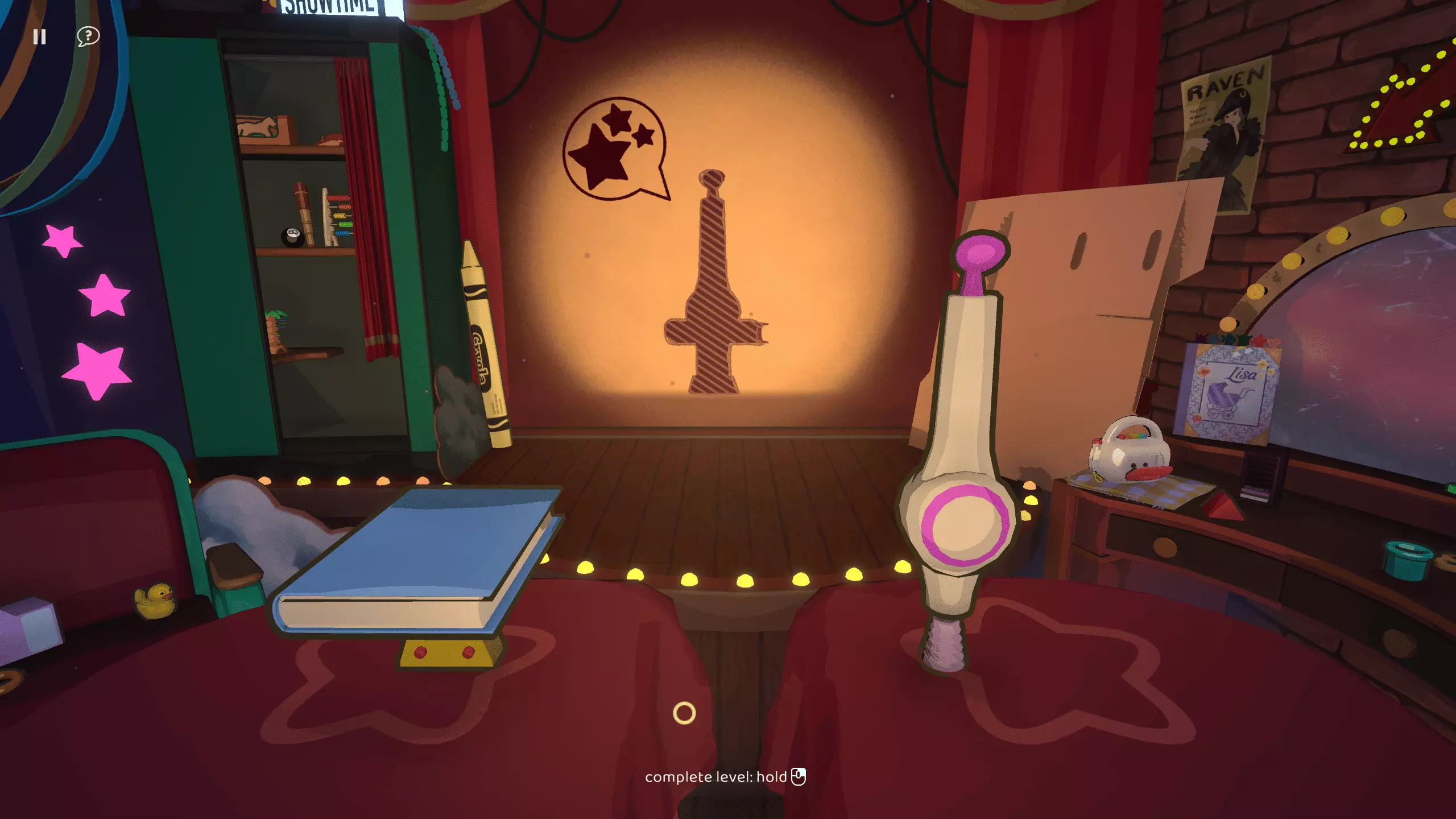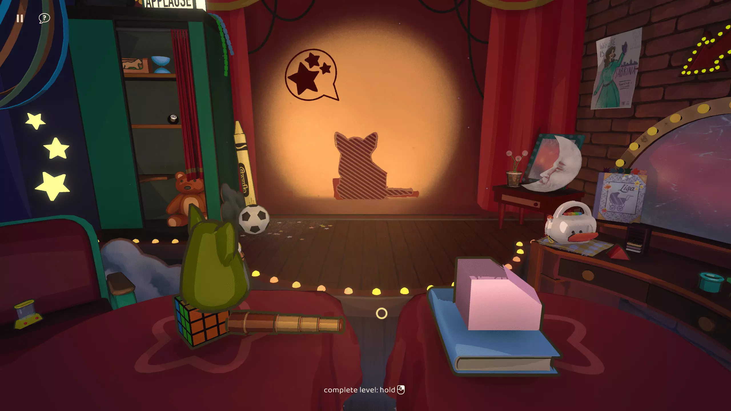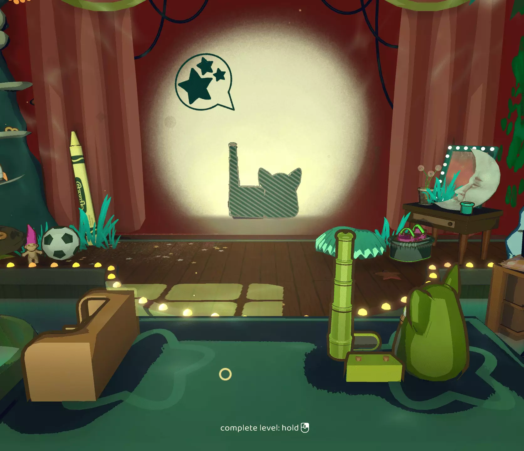 尘埃落定 在【欢迎丽莎】章节中以三星评价完成所有关卡 第二章:我的闪耀之星 第二章引入了聚光灯机制。通过使用两个光源,你可以使物体重叠。