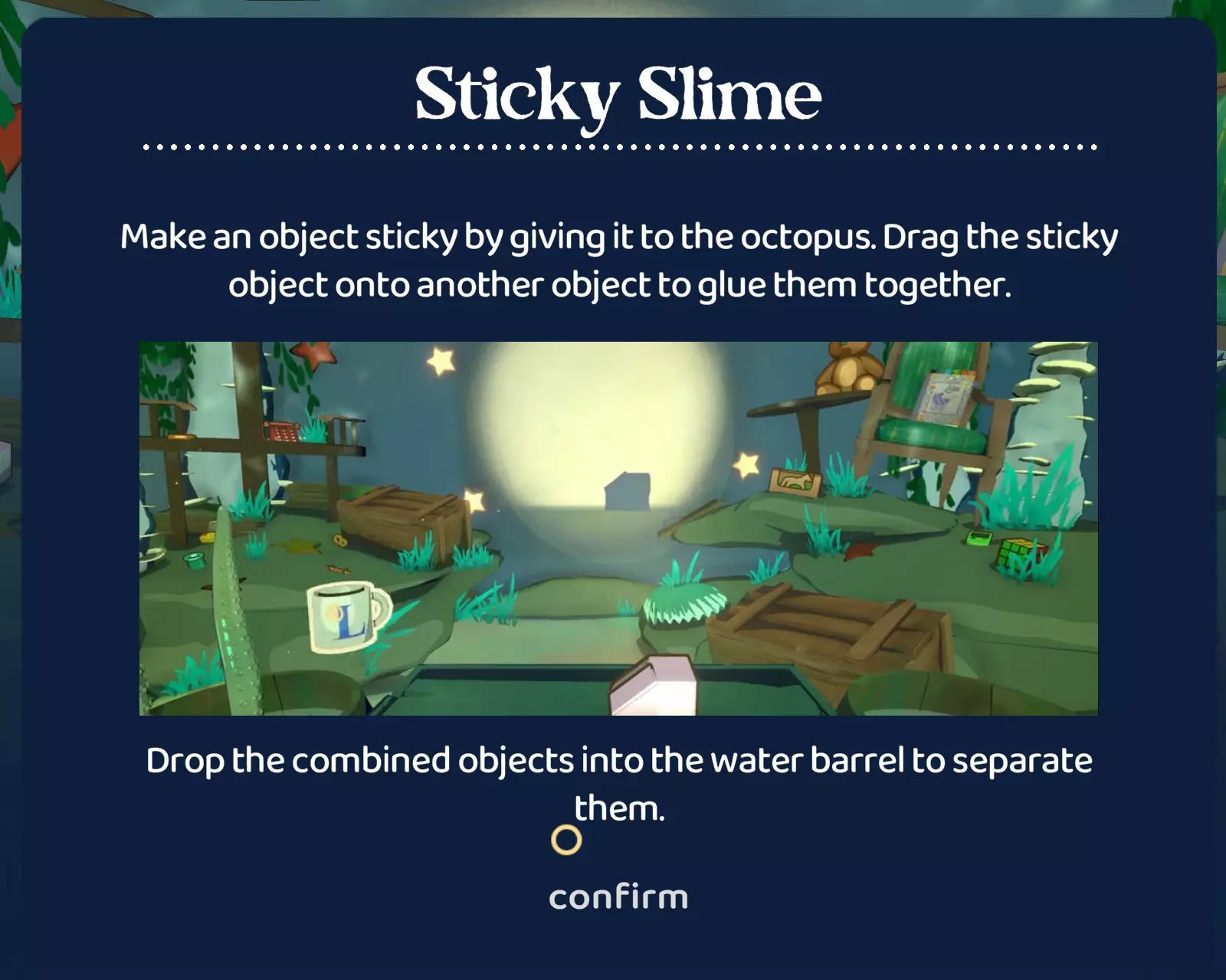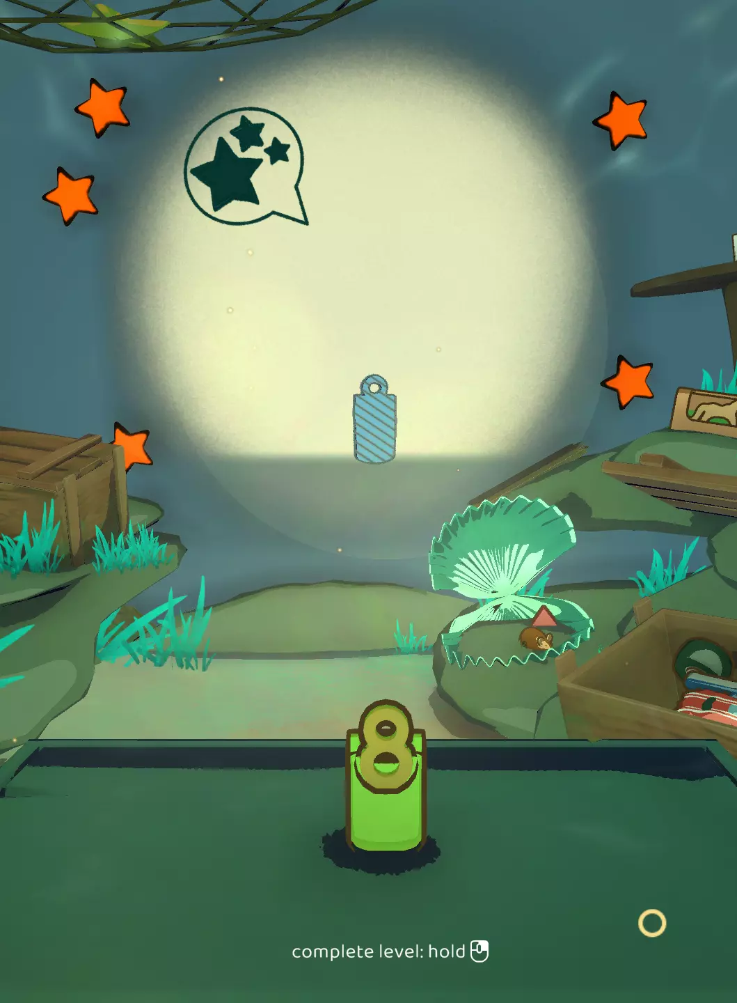 【闹鬼的房子】 在【食尸鬼的问候】章节中,以三星评价完成所有关卡 第四章:我们的爱比任何海洋都深 第四章引入了粘性史莱姆机制。在我们的新朋友章鱼的帮助下,你现在可以将两个物体粘合在一起。但要小心,物理规律仍然适用,一个物体的重量可能会使另一个物体倾斜。