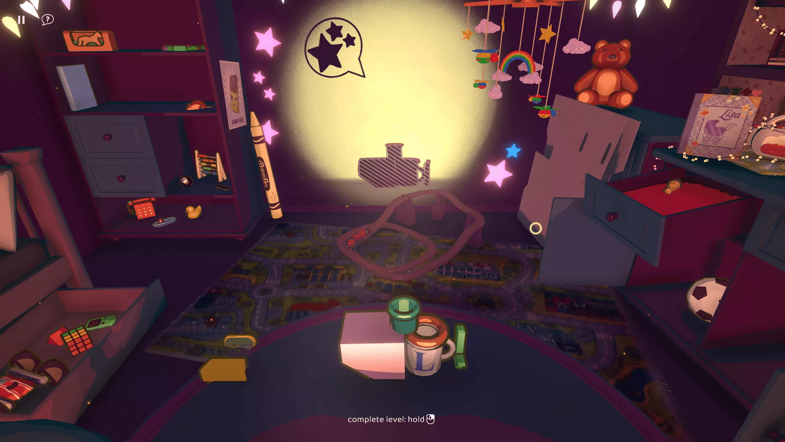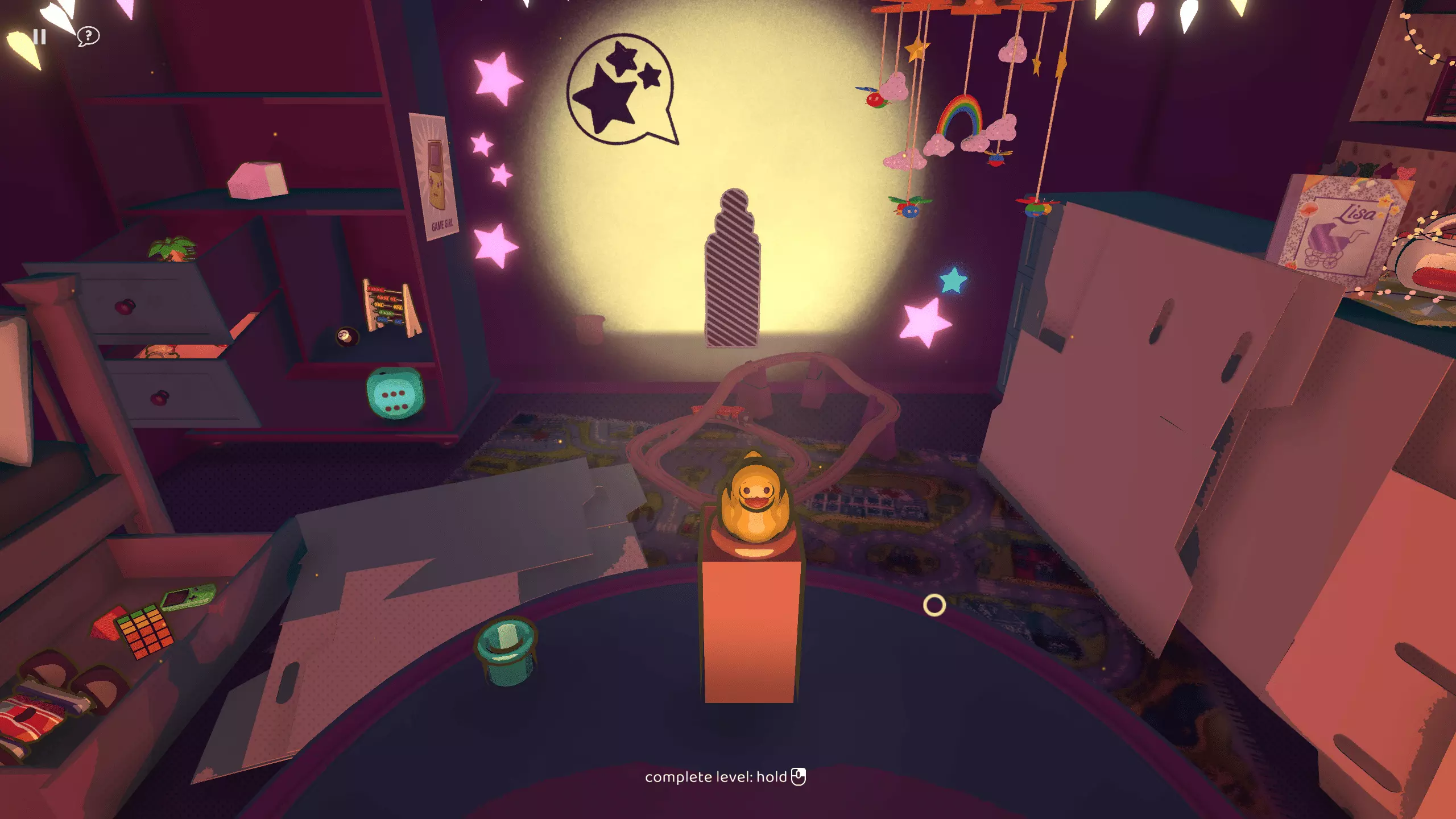 《欢迎莉萨》中的次要互动:按下星星会发出声音并改变颜色。火车可以加速,但永远不会停止移动。你可以打开/关闭屏幕左上角的窗帘和窗户。触摸手机时手机会移动。 总结:欢迎莉萨 必解锁成就