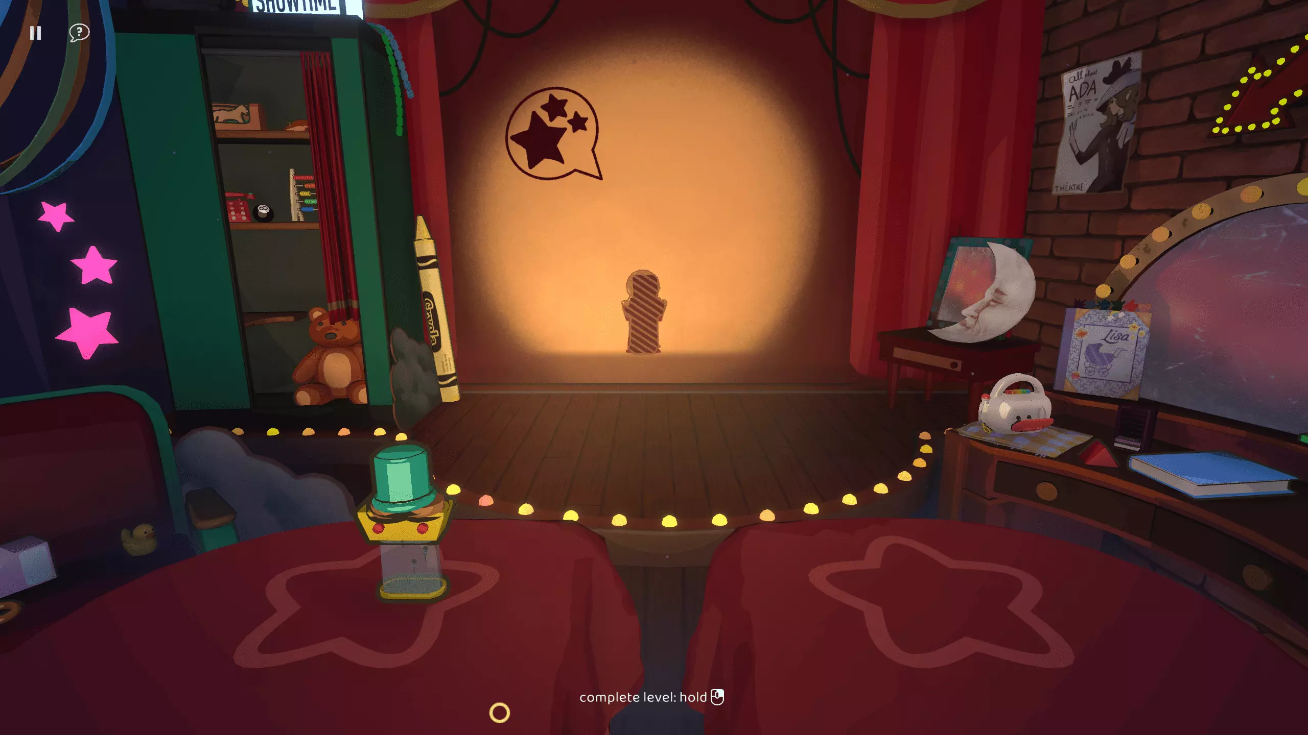 表演时间 在【我的闪耀之星】章节中以三星评价完成所有关卡 第三章:食尸鬼的问候! 第三章引入了幽灵机制。我们的新朋友可以使物体隐形(该物体不会投射阴影),但它仍然是可触碰的。