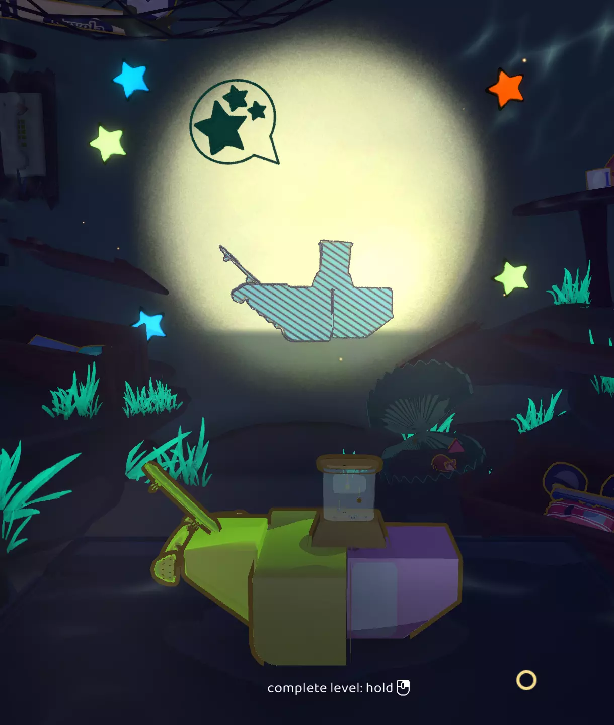 要达成【Unsticked】成就,你需要在不使用触手的情况下以三星评价完成一个关卡。这里有一个解决方法:小船+马克杯