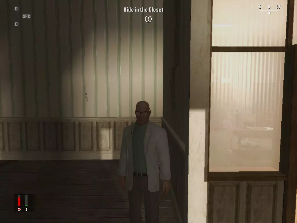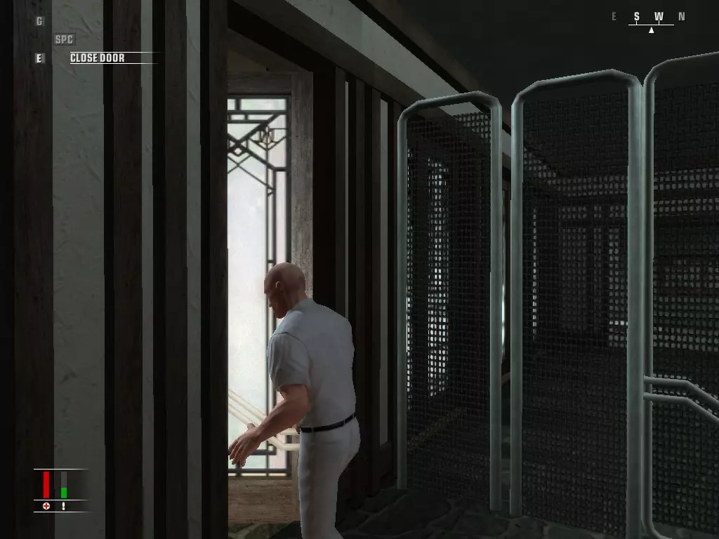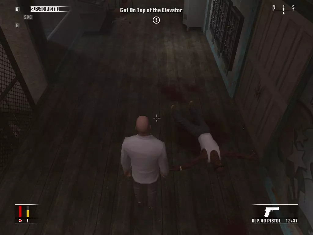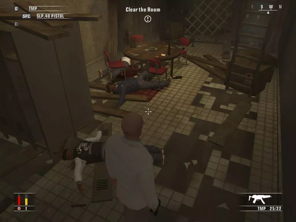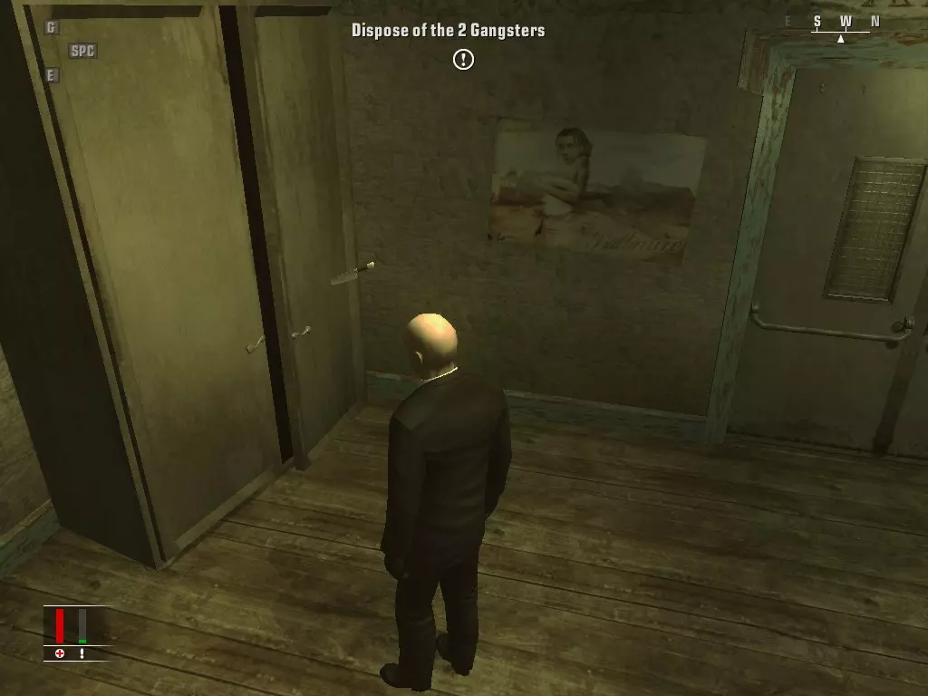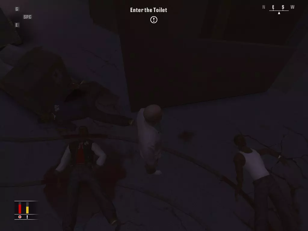 继续前进,走进浴室,里面有个正在小便的男人。偷走他旁边的枪,然后走到他身后抓住他,把他当作人肉盾牌。带着他走进隔壁房间,杀掉正在玩扑克的三个人,然后如果盾牌还没死的话就杀了他。