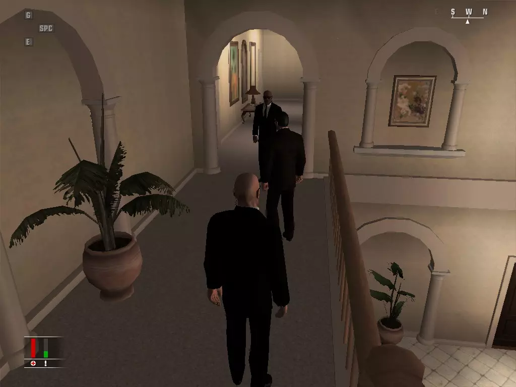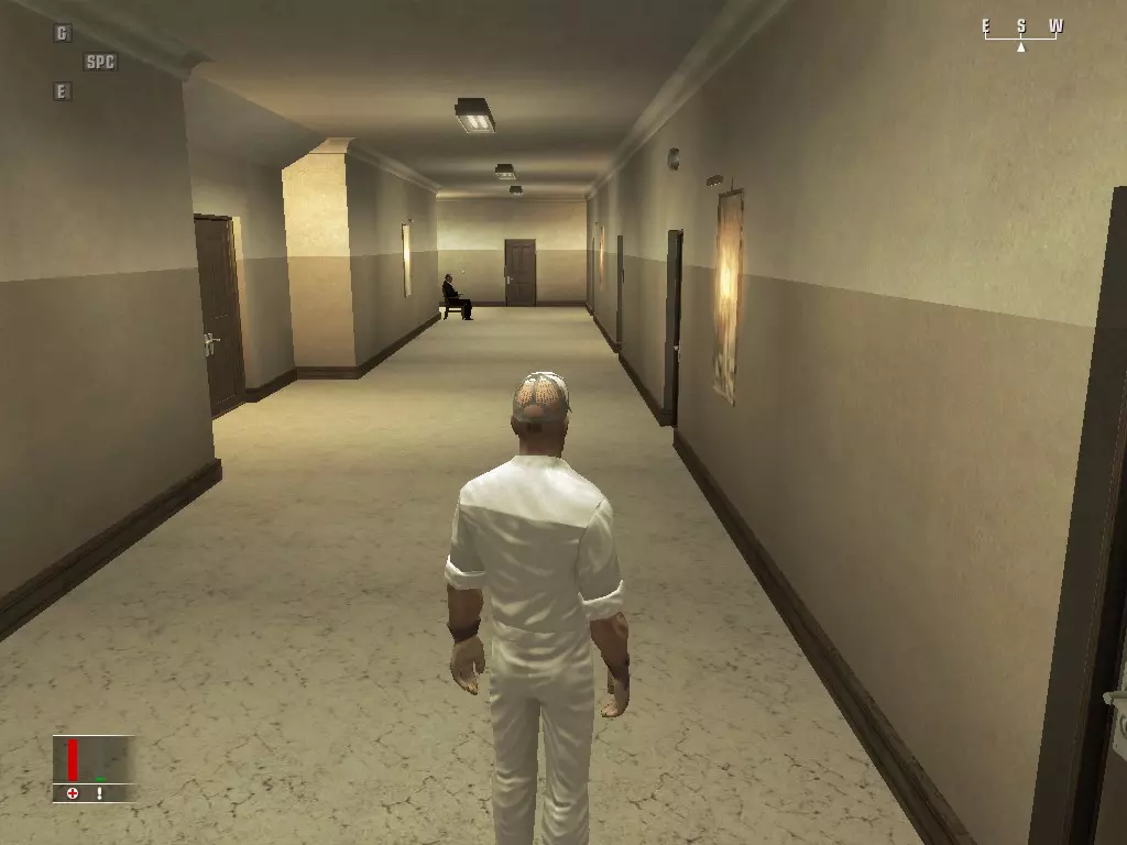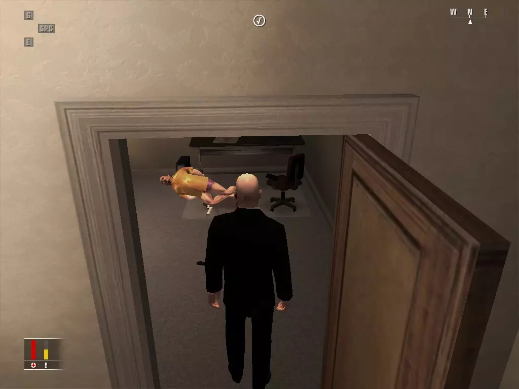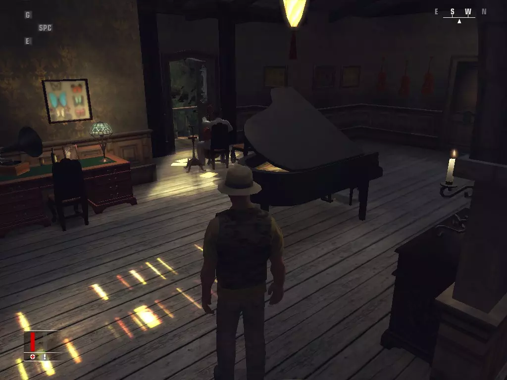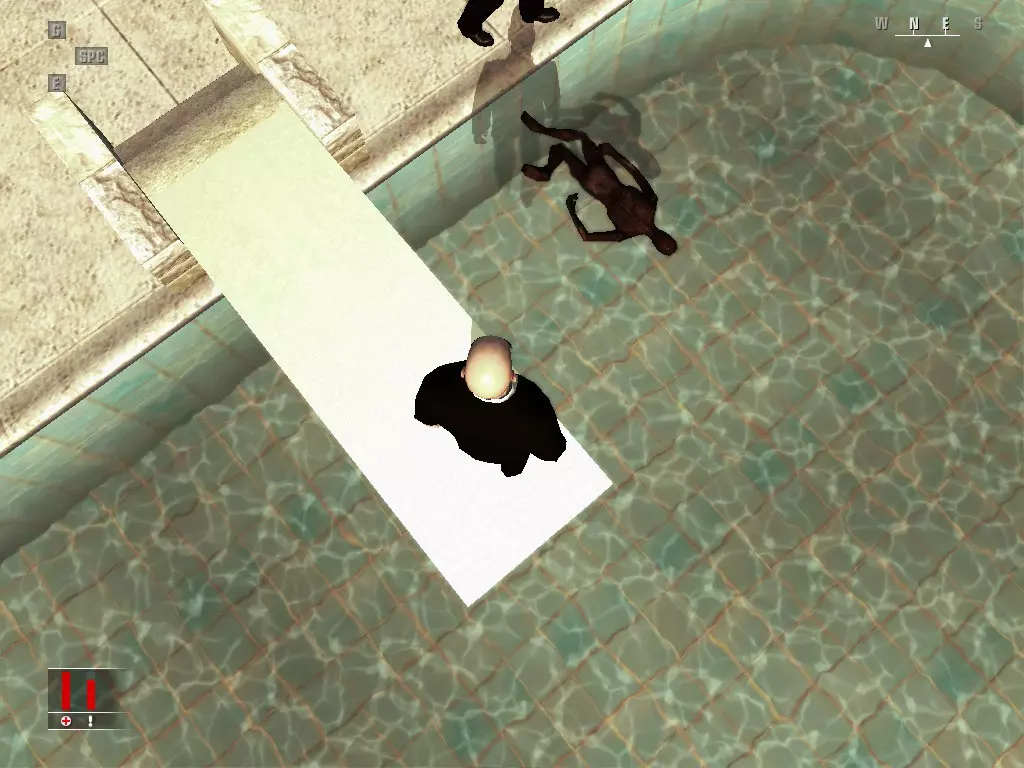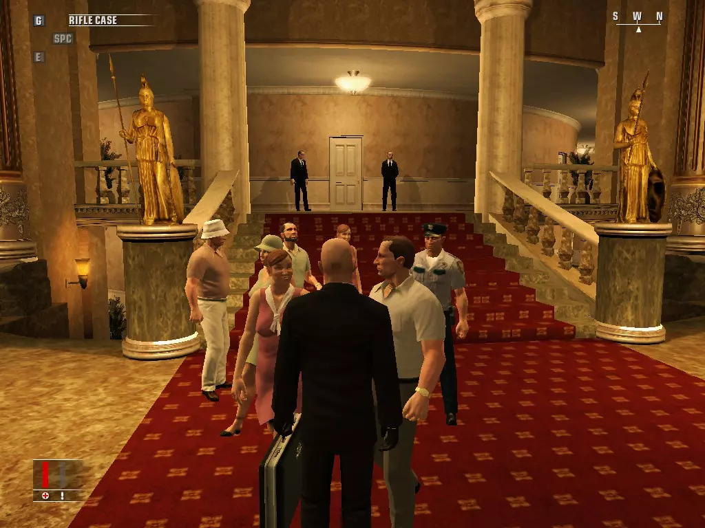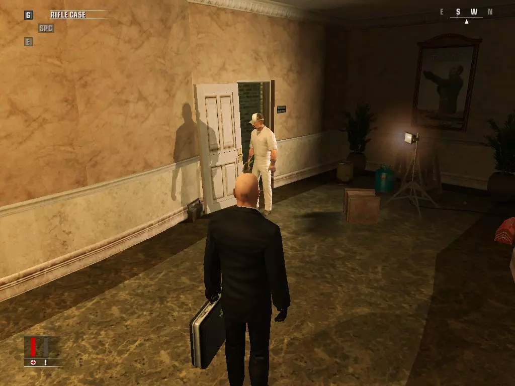 继续前进,走进浴室,里面有个正在小便的男人。偷走他旁边的枪,然后走到他身后抓住他,把他当作人肉盾牌。带着他走进隔壁房间,杀掉正在玩扑克的三个人,然后如果盾牌还没死的话就杀了他。