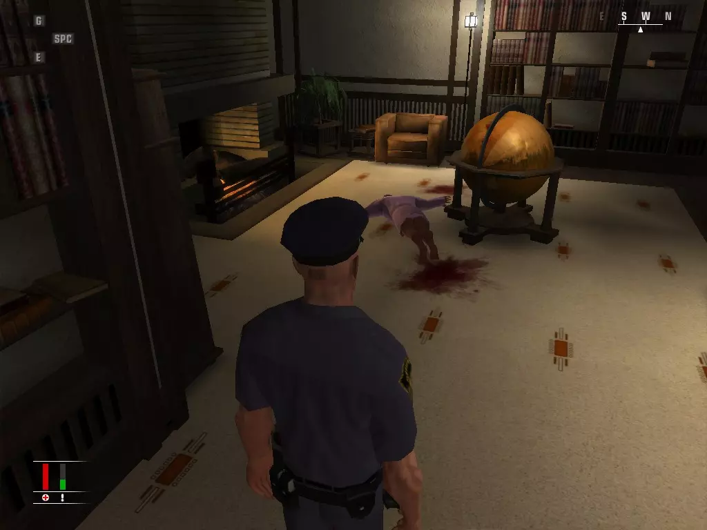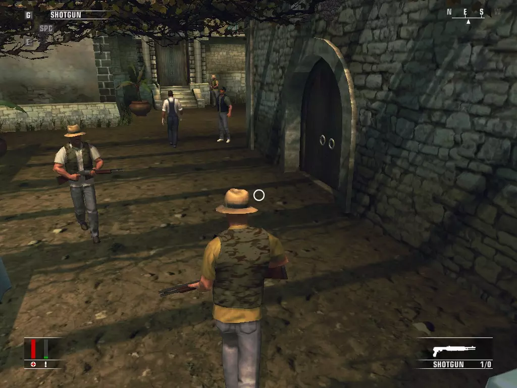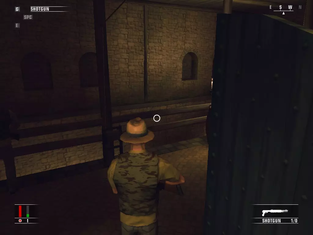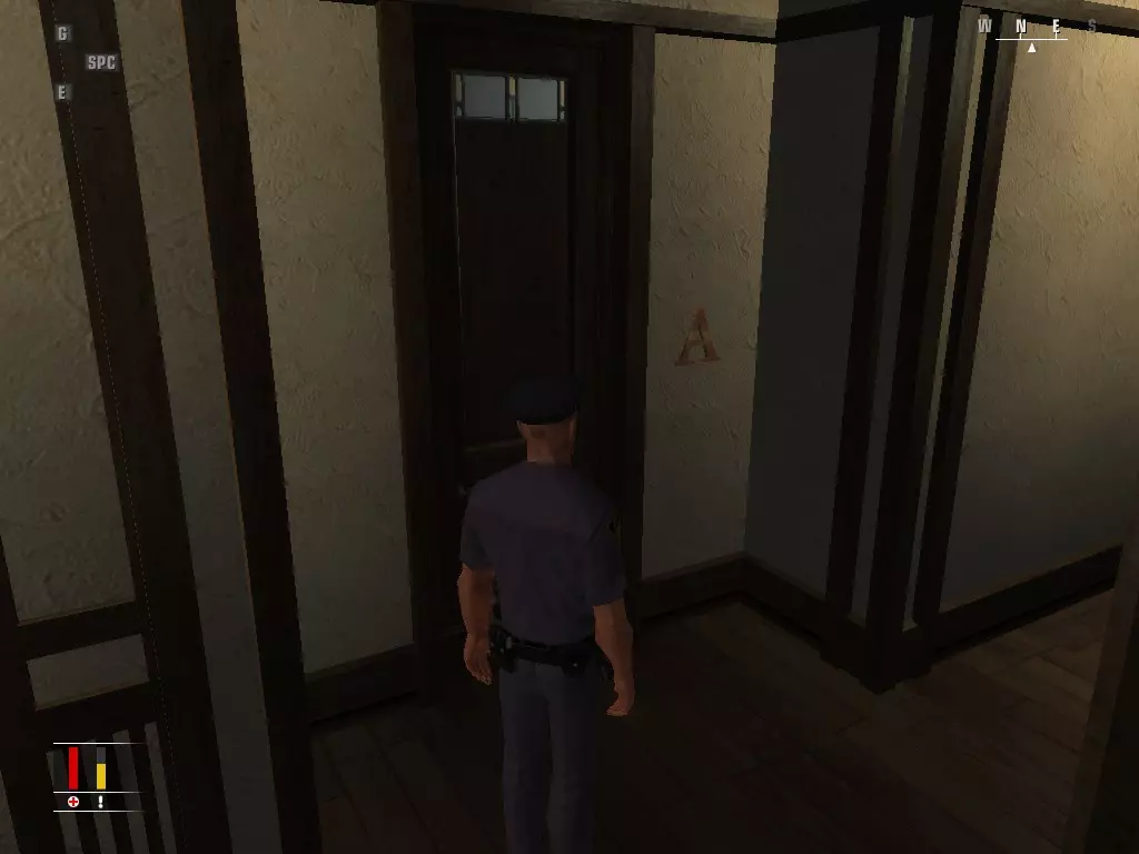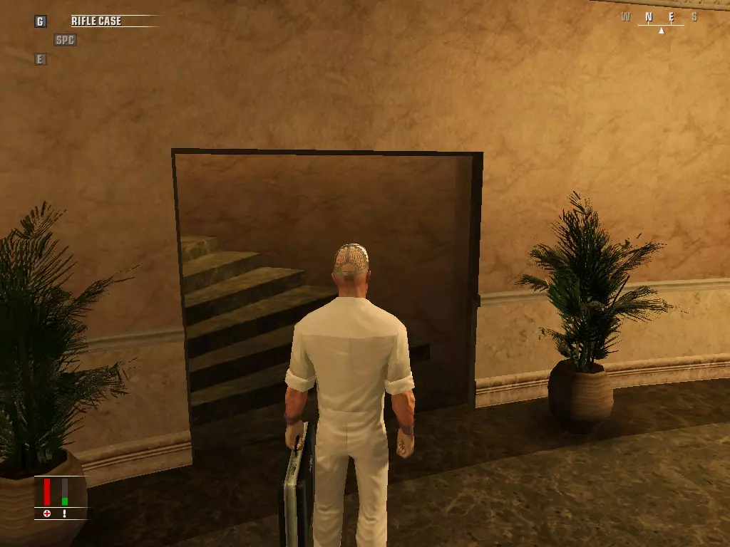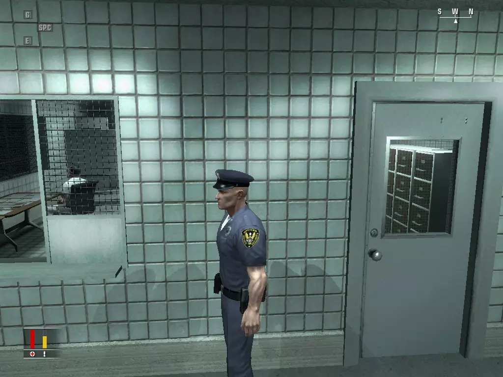 继续前进,走进浴室,里面有个正在小便的男人。偷走他旁边的枪,然后走到他身后抓住他,把他当作人肉盾牌。带着他走进隔壁房间,杀掉正在玩扑克的三个人,然后如果盾牌还没死的话就杀了他。