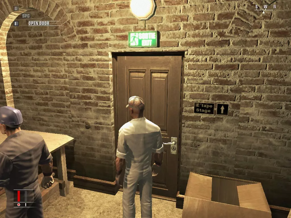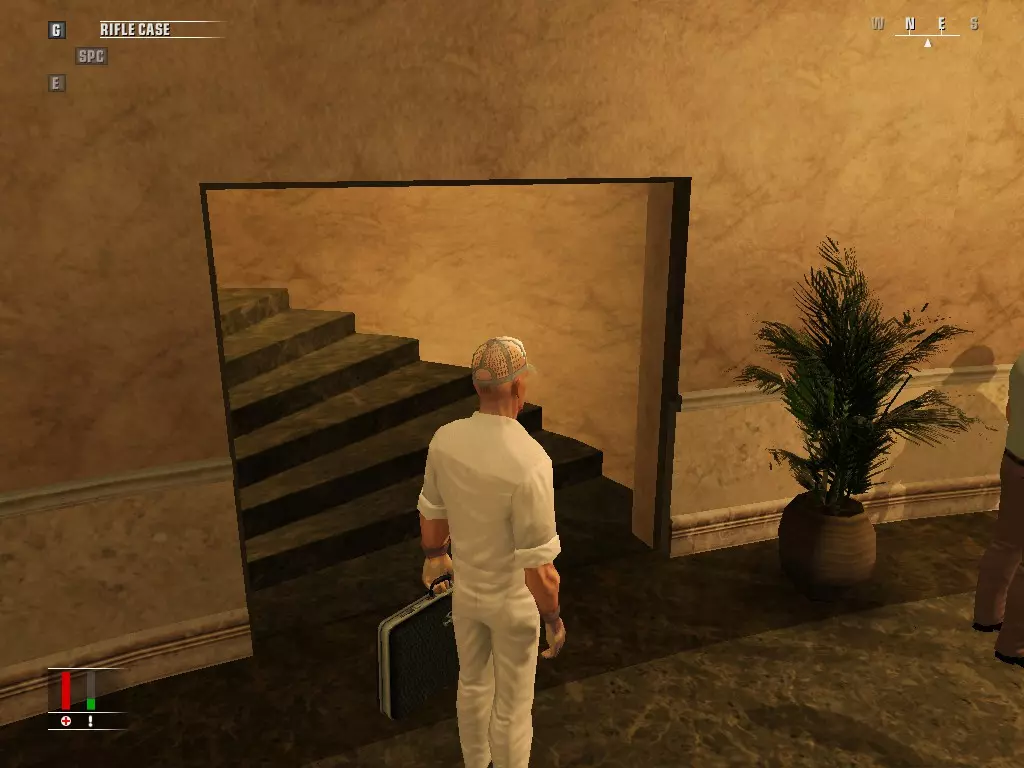 从他身边走过,他会跟着你,将他击晕,【不要杀死他】,然后偷走他的衣服。确保血迹不会溅到门外的门槛上。把步枪箱留给那个家伙,然后下楼。下楼后你会看到一个网格管道状的东西,记住它,我们稍后会回到这里。
