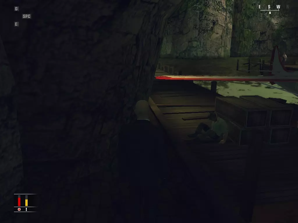 就在旁边有一条小悬崖小径,沿着它可以下到你将要乘坐逃生的水上飞机那里。把码头上的守卫推下去,然后悄悄绕过那个睡着的守卫。