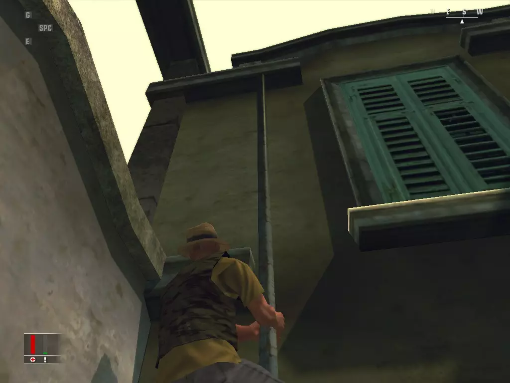 走到远端的墙边,找到庄园的排水管,然后开始向上攀爬。