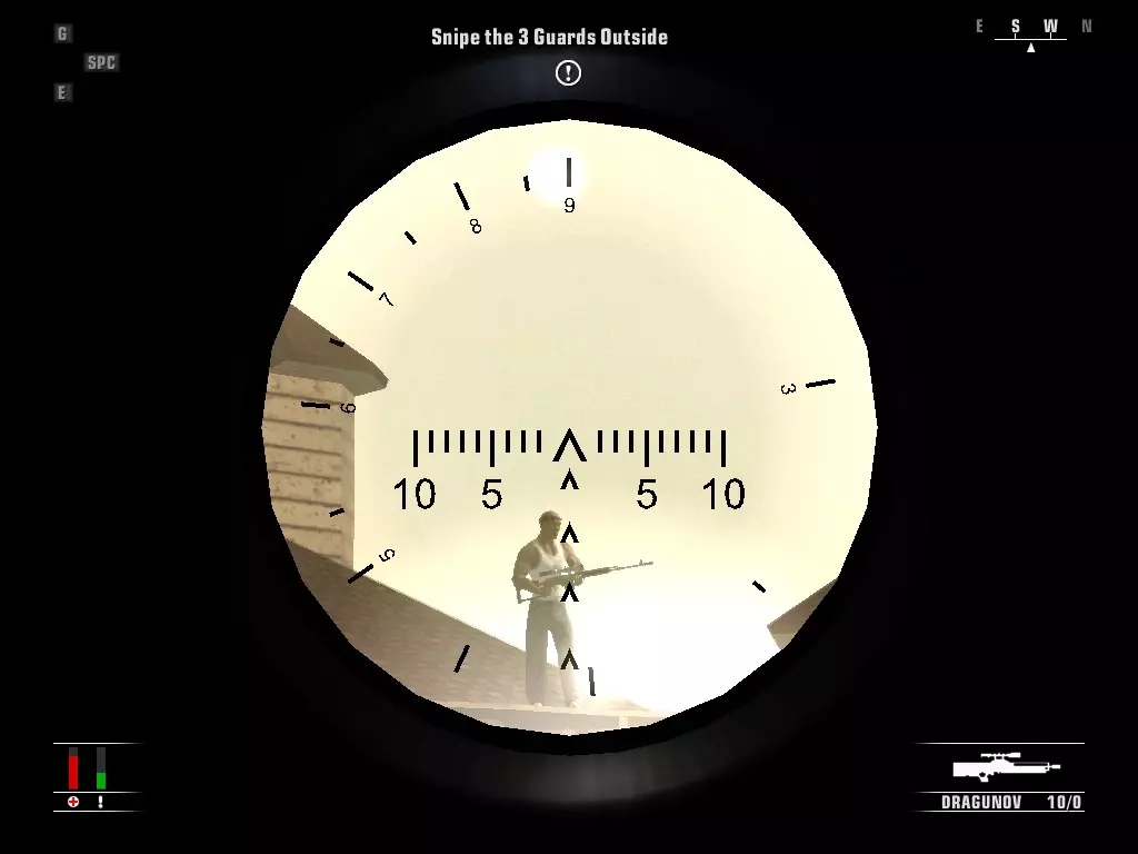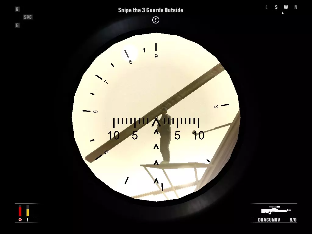上楼并打开箱子取出步枪,然后消灭在外面巡逻的三名守卫。