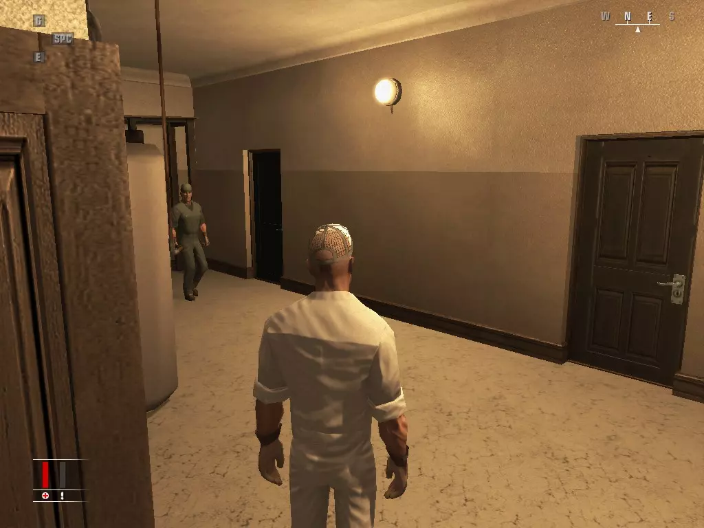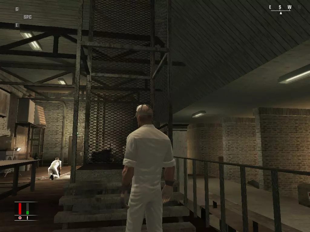 杀死走进来的那个男人,然后走下楼梯,在院子的右侧找到健身房,穿绿色衣服的人就是你的目标。等他举重时,从他身后走过去,当他做卧推时会出现选项,通过掉落杠铃砸死他。完成后走到院子右侧,找到警卫室,偷走钥匙卡,然后穿过牢房。