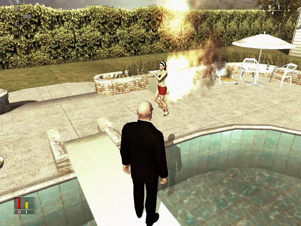 放下枪,然后走向那只狗。继续朝后方走,找到小屋,打开小屋并偷走烧烤液。前往泳池,用液体布置好装置,然后观赏“烟火”。