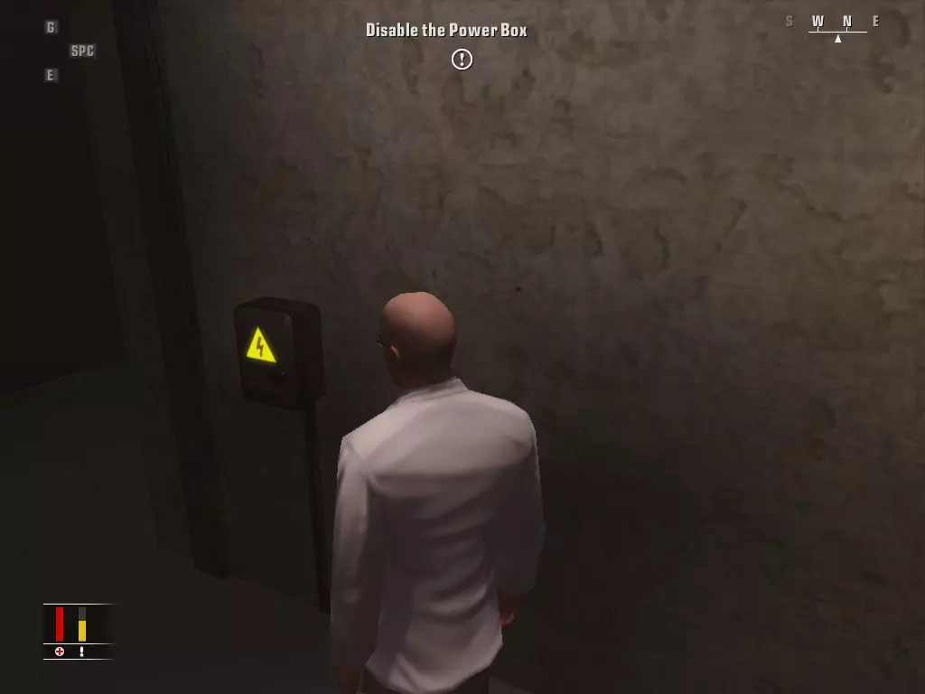 前往电梯处,通过勒颈杀死里面的守卫。完成后跳进电梯,然后走向墙上的保险丝盒。
