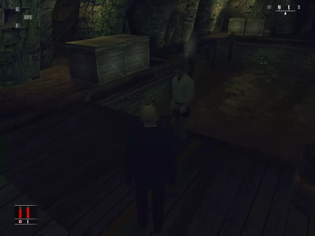 打破箱子然后走进房间,里面有三个看不到你的守卫,我总是会杀掉他们,但你不需要这么做。