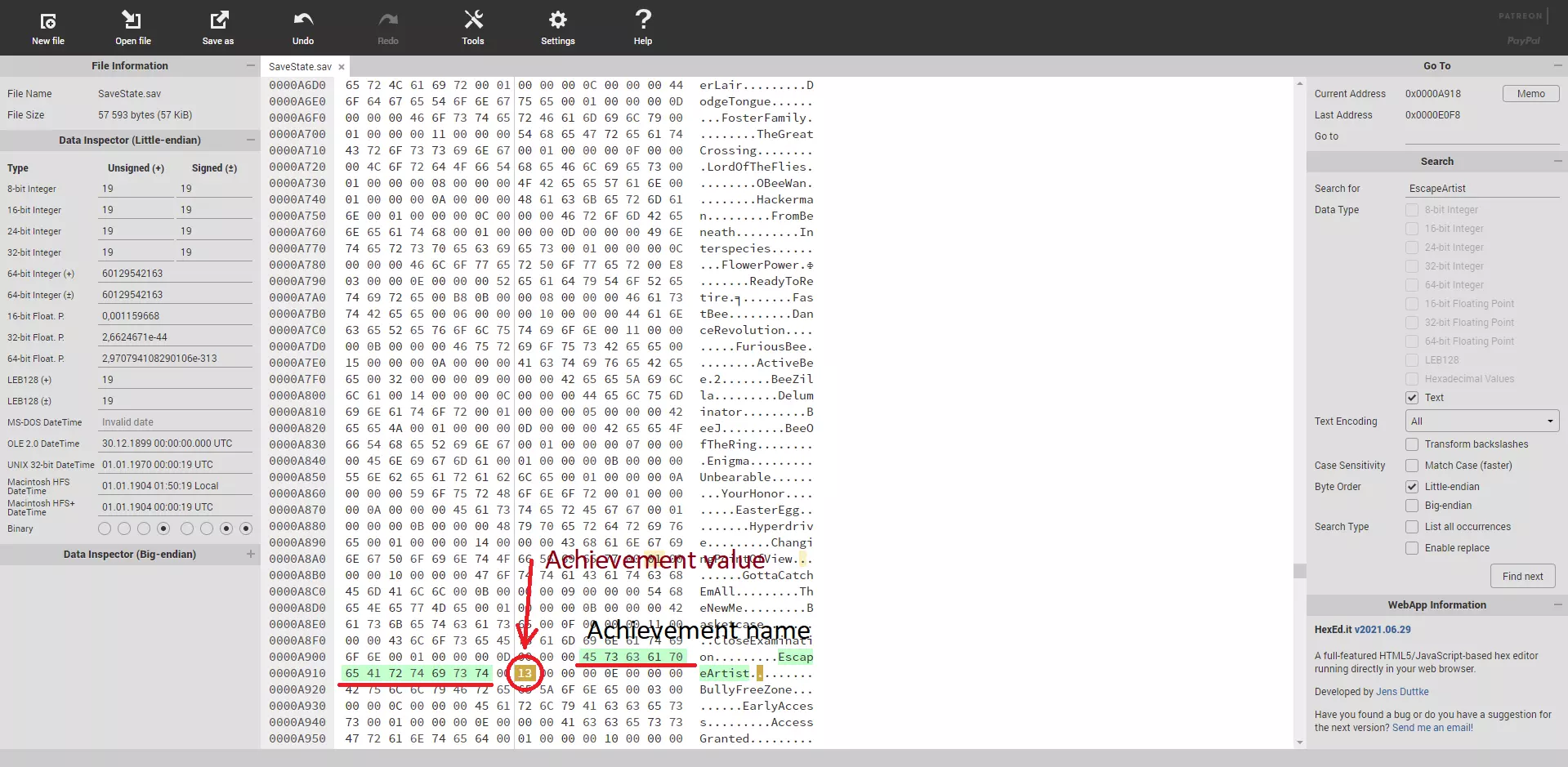 本指南将教你如何获取【Real Achiever】成就,适用于除该成就外已获得所有成就的情况。 简介 《蜜蜂模拟器》早期版本中,所有存档共享成就进度。那时候,你可以在一个存档中购买6个雕像,在另一个存档中购买5个雕像,从而避免数小时的昆虫搜寻,那是一段美好的时光。但开发者以一种奇怪的方式修复了这个问题…… 现在每个存档都有独立的成就进度。这使得【Real Achiever】成就变得难以达成,除非你在一个存档中获得所有成就。如果你的成就出现 bug 或错过了任何可能错过的成就?那就尝试在另一个存档中重新获取所有成就(这可能需要再花费10多个小时)。本指南将教你如何避免这种情况。 存档编辑器 存档文件位置:C: Users {用户名} AppData Local BeBee Saved SaveGames SaveState。存档文件结构: 头部 存档位1 { 任务与挑战进度, 成就进度 }, 存档位2 { 任务与挑战进度, 成就进度 }, 存档位3 { 任务与挑战进度, 成就进度 } 问题在于它并非纯文本,因此需要使用十六进制编辑器才能编辑这些数据。我曾使用过在线编辑器,不过你也可以尝试其他任何十六进制编辑器。 那么,开始吧!在开始之前,请确保你已进行备份,并且除了Real Achiever外,已获得所有成就(50/51)。 1. 打开存档文件。你会看到十六进制数值: