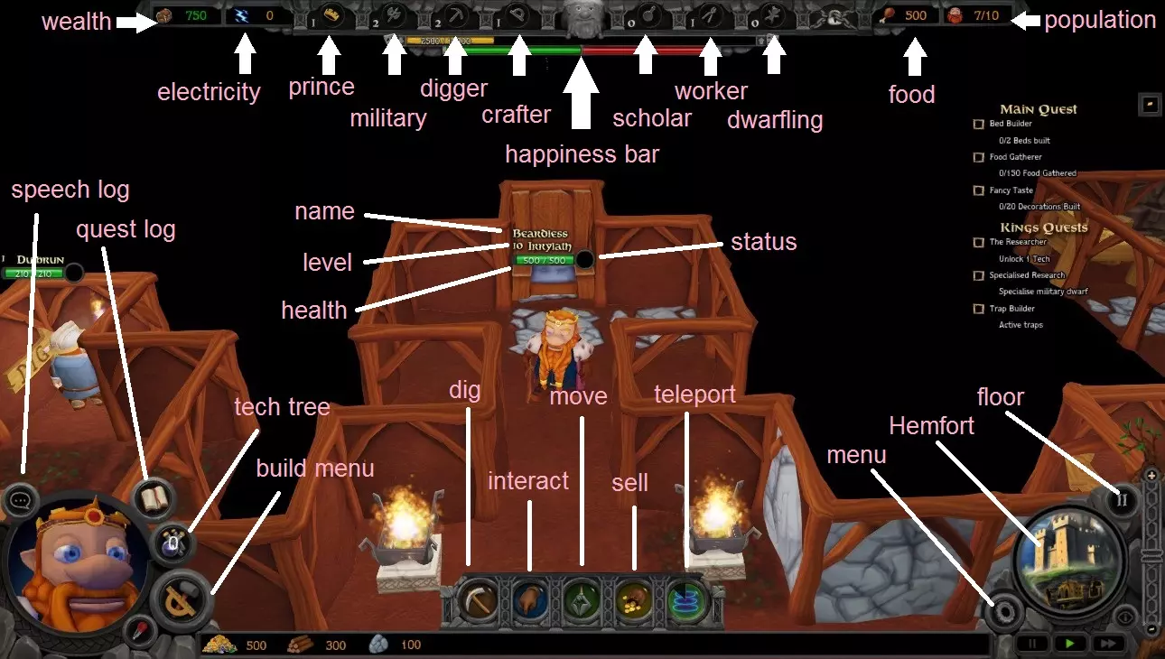 《矮人游戏》新手完全指南 背景故事 很久很久以前,在一座……不,等等。我是说,就在这附近,就在这座山里,第一批矮人来到了这个世界。矮人们拥有无限的野心,以及无论决心做什么都能成功的天赋。他们挖穿山脉,建造出奇妙的工艺品和建筑,并且拥有钢铁般的勇气去面对最凶猛的怪物……并且取得胜利。在通往荣耀的道路上,他们遇到了其他种族,比如敏捷的精灵和强大的龙。在他们的帮助下,矮人们很快从家乡扩散开来,建立了一个庞大的王国。但那是很久以前的事了,那时的我也只是个古老的存在。最终,一切还是因为变故而改变。他们来自北方的未知区域。是法师。矮人从未见过这样的存在。他们掌握着名为【魔法】的强大能量,还带来了那些似乎憎恨整个世界的可怕生物。即便如此……矮人仍伸出了友谊之手。但法师们毫无此意。他们向矮人发动攻击,伟大的黑暗魔法战争就此爆发。巨龙赶来援助矮人,可法师们力量强大,竟将巨龙从空中击落并摧毁。精灵逃离了这片土地,任由矮人独自奋战。高贵的矮人对抗着无情的法师以及他们所带来的可怕毁灭,为生存进行了漫长而艰苦的战斗。孤立无援之下,矮人被迫节节败退。但很快,矮人将再次崛起,他们将建立一个配得上他们被窃取荣耀的文明。控制键 W - 向前移动镜头(备选:将鼠标移至屏幕上边缘) A - 向后移动镜头(备选:将鼠标移至屏幕下边缘) S - 向左移动镜头(备选:将鼠标移至屏幕左边缘) D - 向右移动镜头(备选:将鼠标移至屏幕右边缘) Z - 放大镜头(备选:向上滚动鼠标滚轮) X - 缩小镜头(备选:向下滚动鼠标滚轮) Q - 向左旋转镜头(备选:按住鼠标滚轮并移动鼠标) E - 向右旋转镜头(备选:按住鼠标滚轮并移动鼠标) 左Shift - 自由视角,用于360度查看光标所在区域 R - 上移一层(备选:HUD右下角的+号按钮) F - 下移一层(备选:HUD右下角的-号按钮) B - 建造菜单,用于建造床、桌子、椅子等 V - 吸管工具,用于在建造菜单中找到物品(如墙纸) H - 打开赫姆福特菜单 用于招募新矮人、提高人口上限以及与赫姆福特进行资源买卖 I - 隐藏游戏界面 L - 任务日志 显示主线任务和国王任务 P - 对话日志 若错过王子的某些对话,可查看此日志 T - 打开科技树 用于选择想要研究的科技 空格 - 切换暂停(备选:点击HUD右下角的暂停按钮) 1 - 挖掘指令 按下此按钮后点击方块,将派遣挖掘工挖掘该方块 2 - 互动指令 某些任务需要与特定物品互动 3 - 移动指令 用于移动物品 4 - 出售指令 出售不再需要的物品 5 -传送指令:当你需要矮人立即前往特定位置时(例如军事矮人),可以使用传送功能,每次可传送5名矮人。当你的氏族规模过大,难以逐个寻找矮人时,可使用以下快捷键定位他们:F1 - 前往王子处,F2 - 前往军事矮人处,F3 - 前往挖掘者处,F4 - 前往工匠处,F5 - 前往研究员处,F6 - 前往工人处,F7 - 前往矮人幼童处。 游戏模式: 战役模式:这是故事模式,每个关卡都会给你分配任务。完成关卡将解锁之前无法进入的区域。根据剧情,你的父亲厌倦了你毫无作为的生活方式,将你赶出家门,让你去自食其力。你最终成为了一个小氏族的领袖,并建立了自己的定居点。就在你以为一切都结束时,你发现父亲早已计划让你夺回所有在与法师战争中失去的矮人城市。你需要获取法师水晶来解锁无法进入的区域,从而在各个地区之间穿行。 自定义模式 此模式类似沙盒模式,你可以根据自己的喜好自定义世界。 事件发生率 - 你的定居点中生成的秘密房间数量 资源 - 为你的矮人挖掘生成的资源数量 安全模式 - 勾选此项将阻止物品在你的定居点中生成 生成敌人物品 - 秘密房间中会出现敌人制造的物品 启用事件房间指示器 - 勾选此项将以【???】显示秘密房间的位置关卡大小 - 地图的尺寸 难度 - 你想要游玩的难度 科技影响 - 勾选方框将解锁该分支的所有研究科技 角色 ***该部分仍在开发中*** 矮人王子